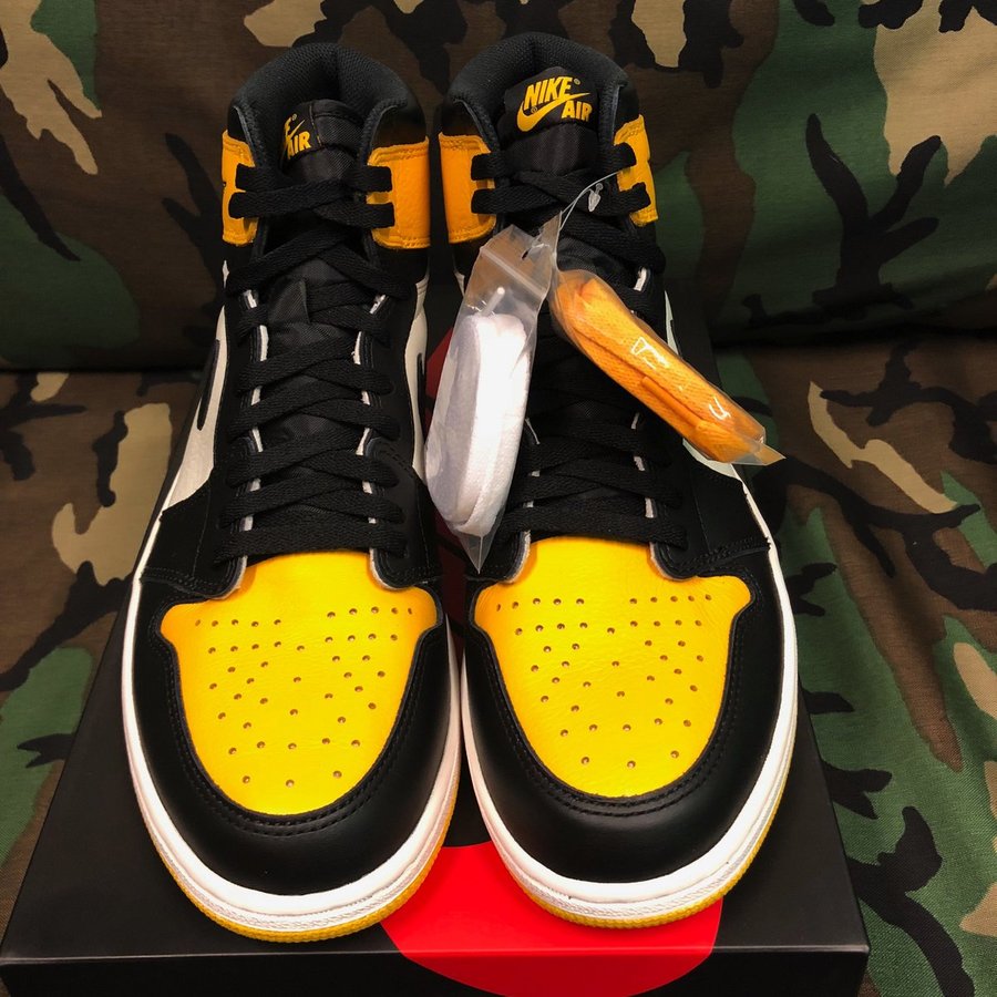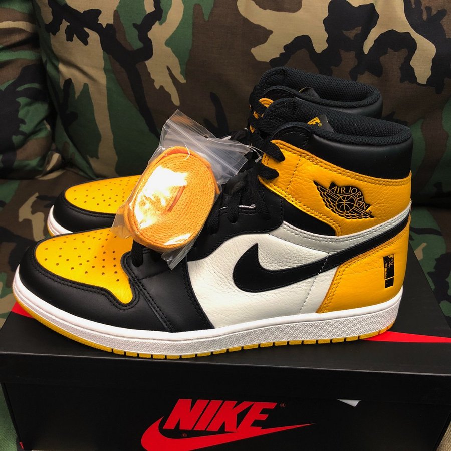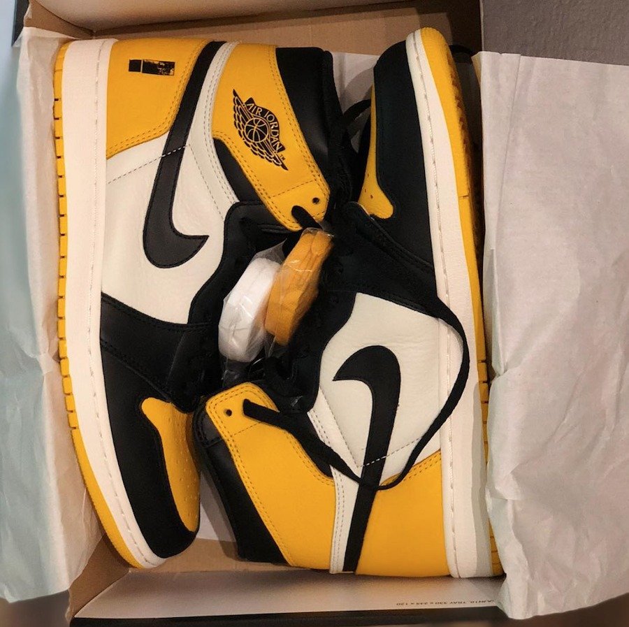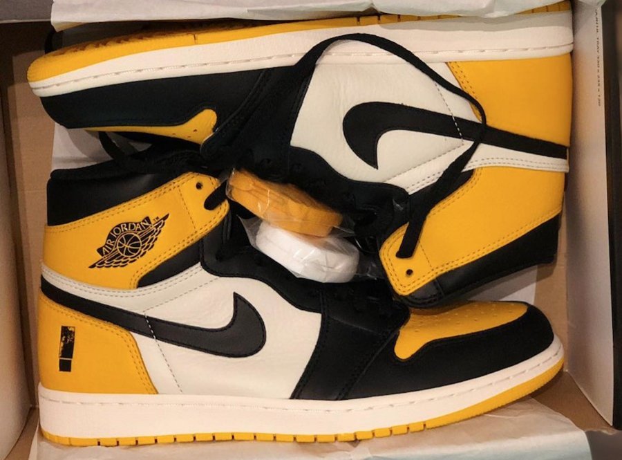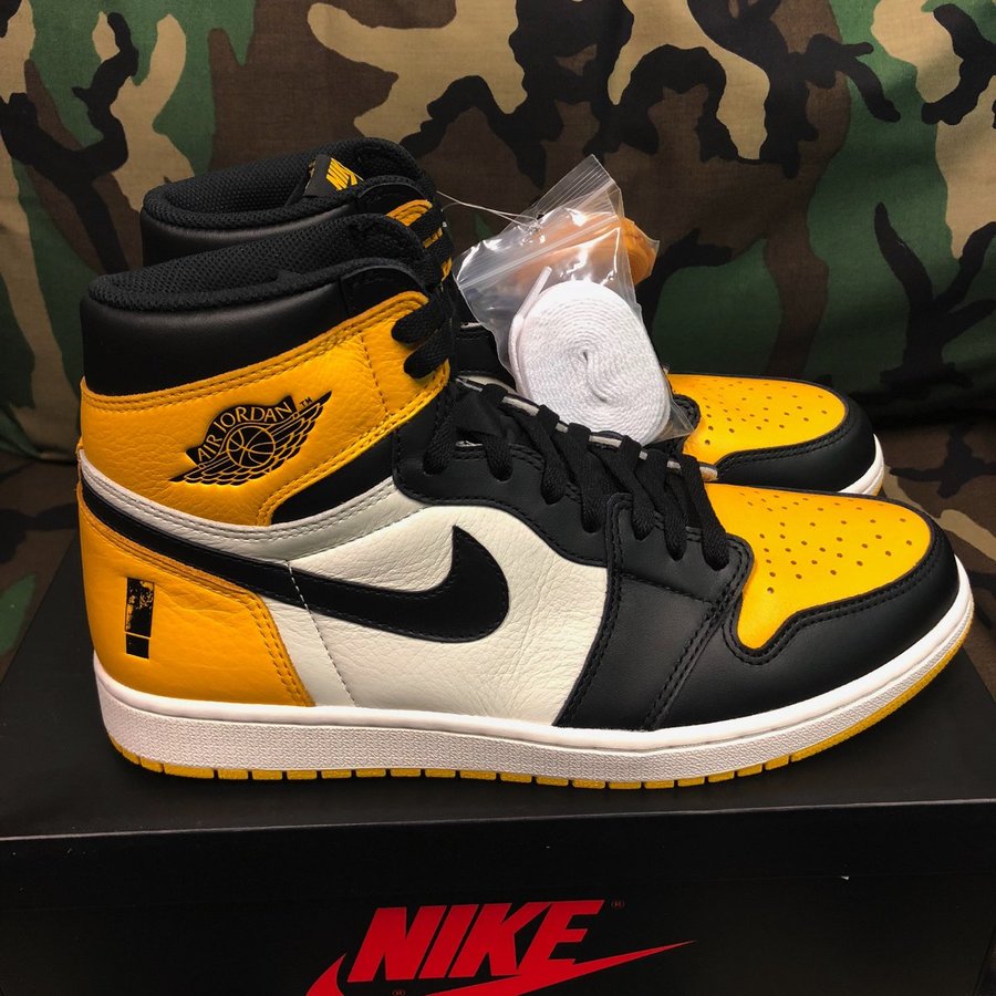 这款 Air Jordan 1 采用了荔枝皮进行打造,搭配黄色、黑色和白色三种颜色。鞋子后跟及内部鞋垫上面的使用了专辑封面上特有的“惊叹号”设计。