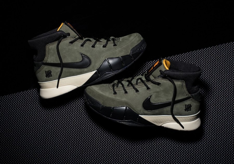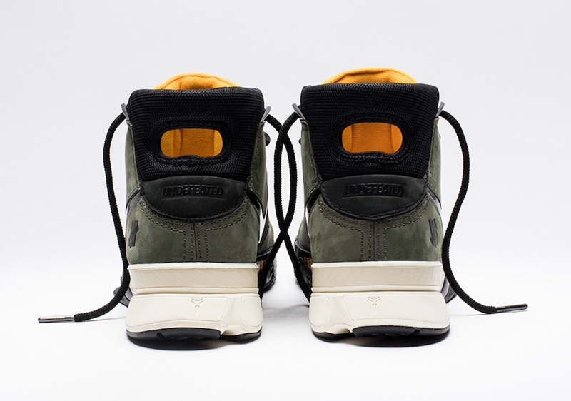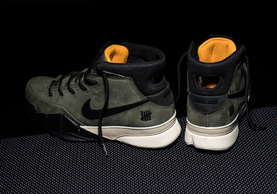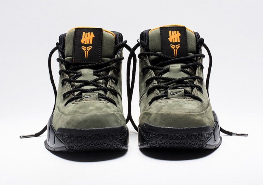 正如此前网络上曝光的照片所示,这双 Kobe 1 Protro 在设计上采用代表 UNDEFEATED 军事风格的橄榄绿作为鞋身主调,并融入橙色和黑色营造对比,而在鞋舌与后侧均可看到 “Five Strikes” Logo 点缀。