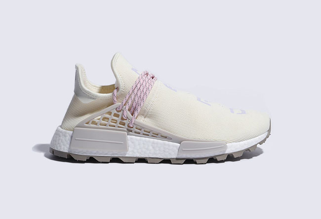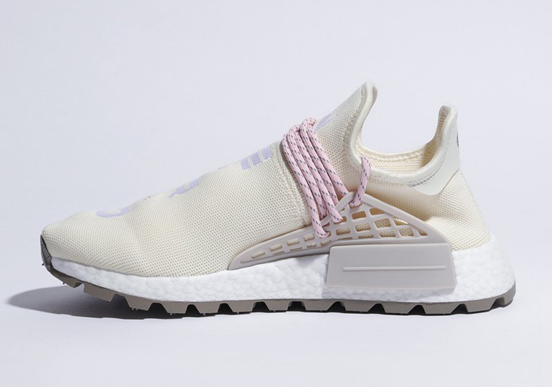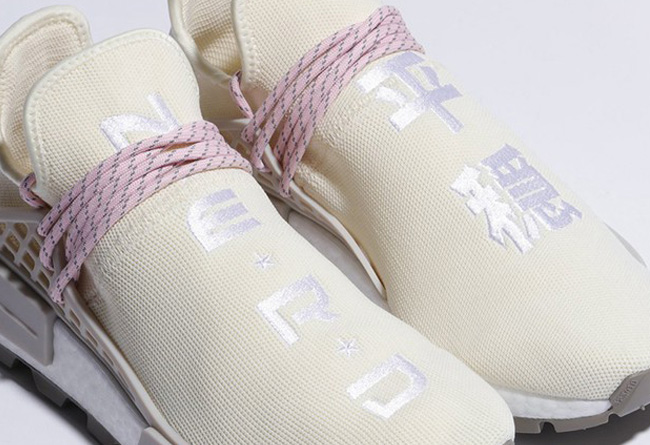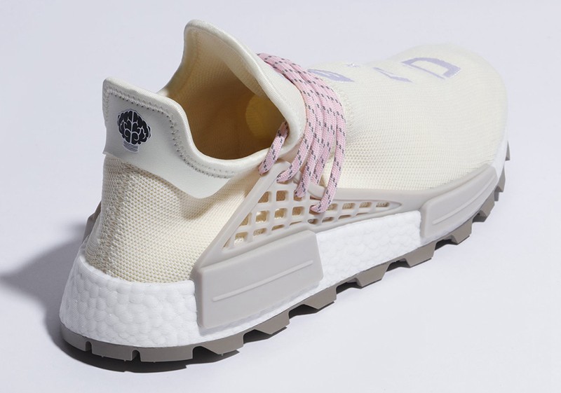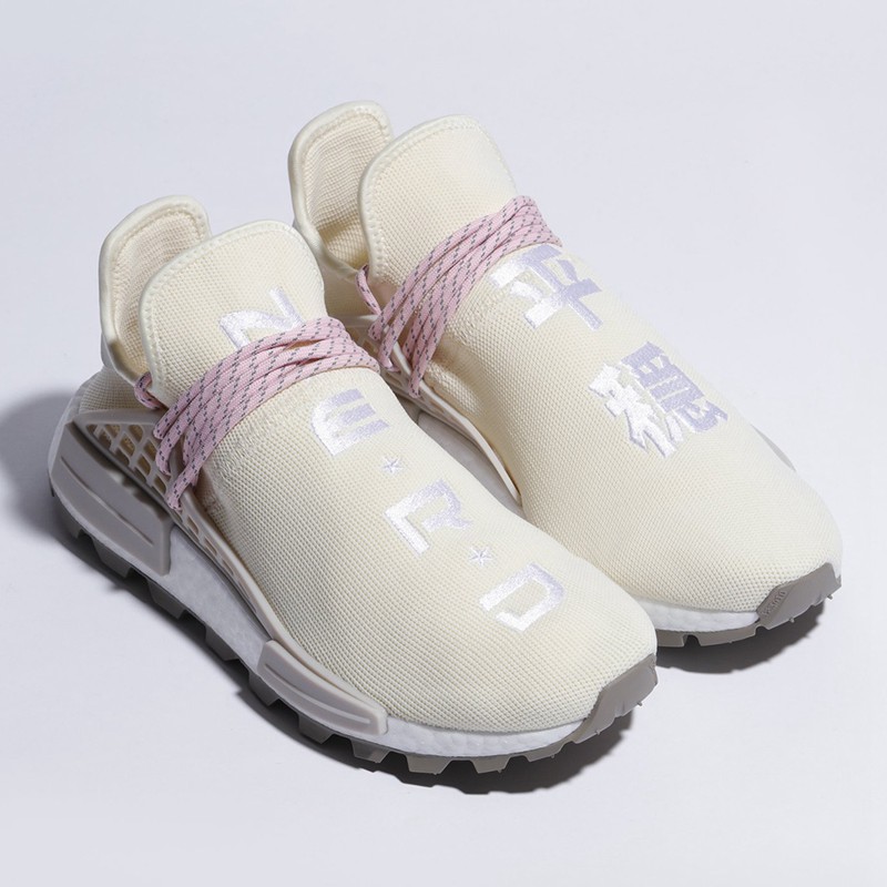 近日,第三双 N.E.R.D 主题配色 NMD Hu 于网络曝光。此双以奶白色织物鞋面示人,配以粉色登山样式鞋带。左脚 “平稳” 的汉字刺绣,右脚则为 N.E.R.D Logo 刺绣,后跟印有 N.E.R.D 著名的 “大脑灯泡” 专辑封面图案,非常具有菲董本人辨识性!