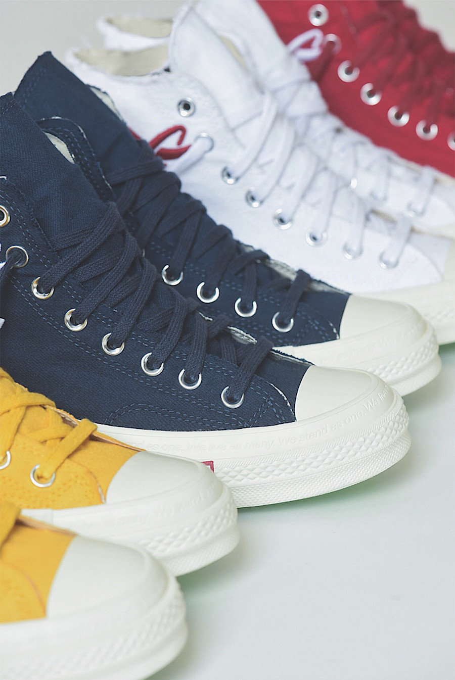 每一款 Converse Taylor 都是用不同的颜色搭配,将世界各地的不同语言版本逐一呈现,这些不同语言对可乐文化来说极具象征意义。而本次所展示的国家包括美国、法国、俄罗斯和中国。