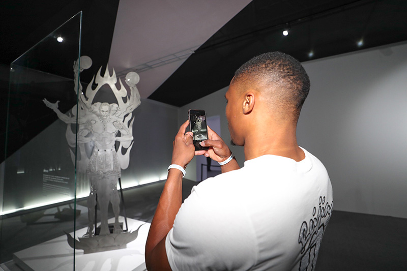 作为展览的首位观众, 威斯布鲁克不仅认真地欣赏了每个作品,还与艺术家们交谈了解作品背后的故事。