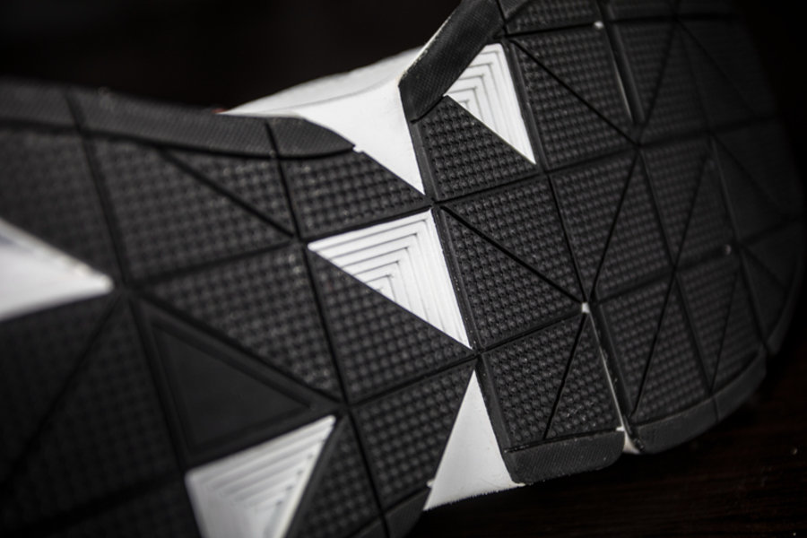 从外底可以看出,中底带有多个三角形镂空,为材料预留形变空间,带来更强下陷感。外底的三角切割搭配中底凹槽,带来良好的弯折性能,令行走更加轻松。外底纹路除了三角形切割,其上还有无数小颗粒凸起,防滑效果相当强劲。