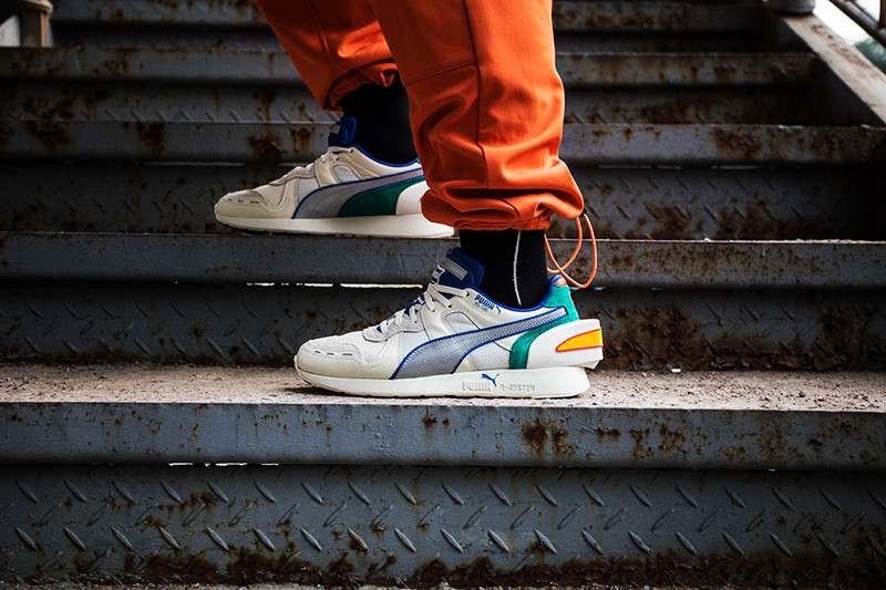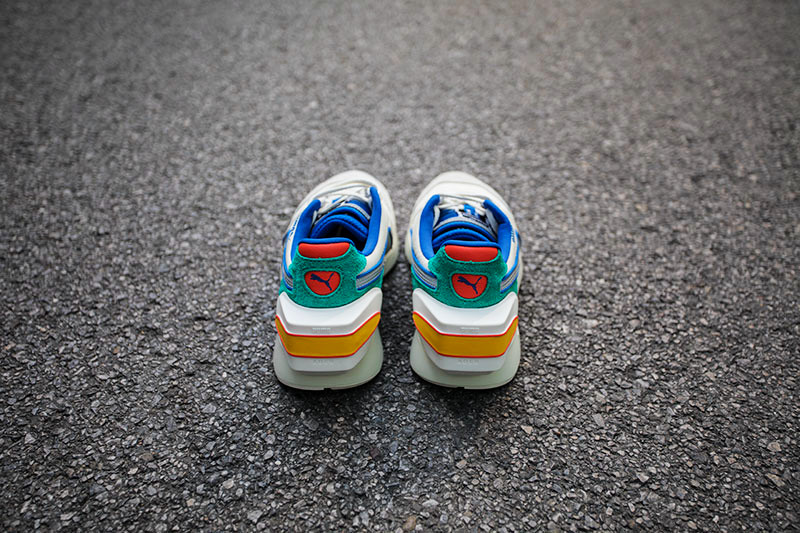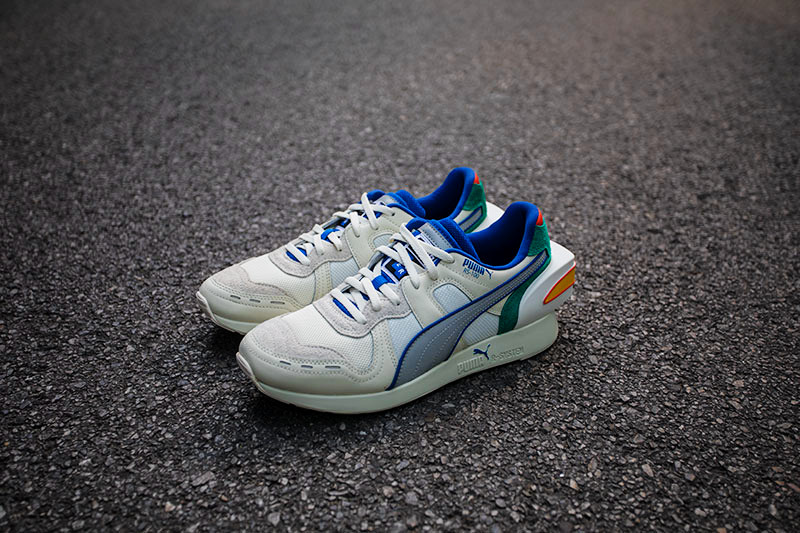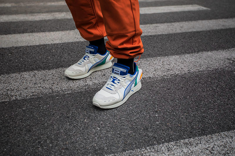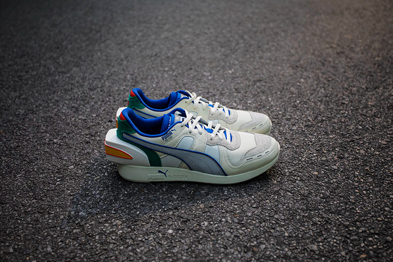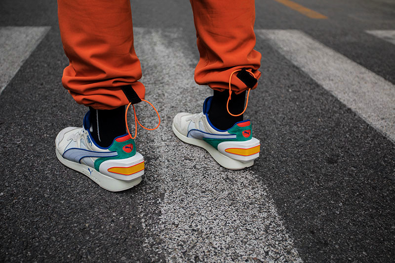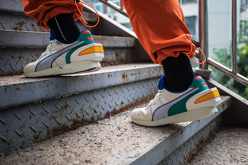 PUMA 招牌的弯刀施以银色,同时搭配草绿与柠檬黄等暖色,怀旧感与科技感并存,营造出亮骚的复古未来配色!