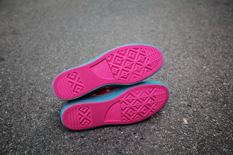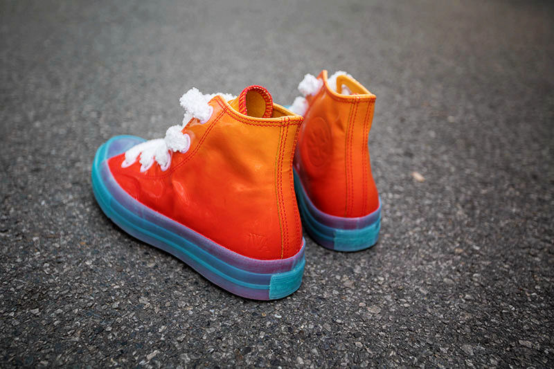 小编手里这双是其中的高帮橙色渐变款。由黄到橙的渐变配色搭配亮眼的漆皮材质,果冻质感中底加上骚粉外底,回头率不言而喻!