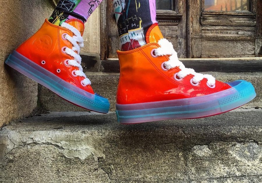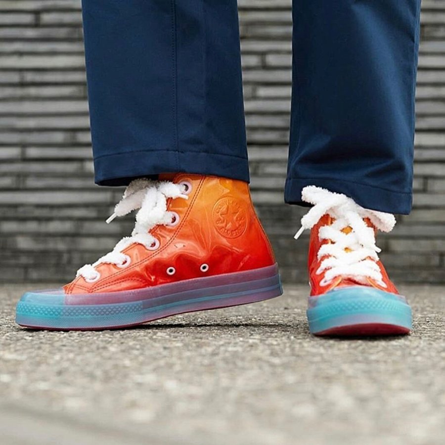 JW x Converse 的联名系列中,最受关注的就是红橙渐变的 Chuck 70,耀眼的漆皮鞋面还有炫彩装扮加持,的确让喜爱酷酷装扮的妹子们无法抗拒。