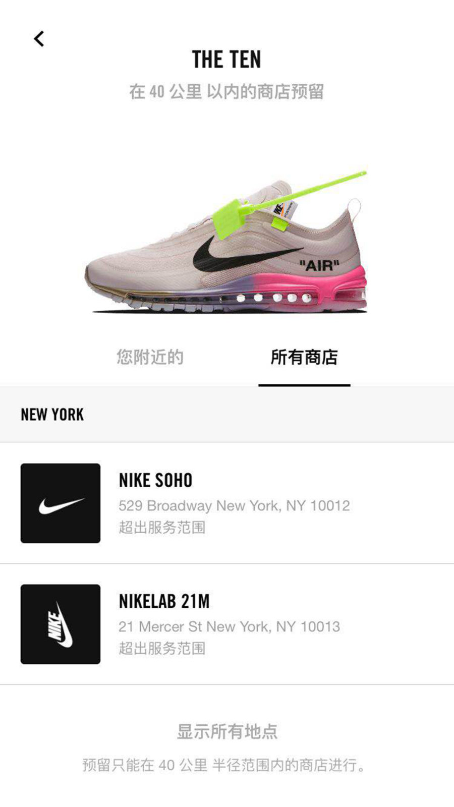 除了这种极具可玩性的发售方式,SNKRS 近期在海外还实验了一种全新形式的突击发售。8 月 21 日,在美国 SNKRS 上出现了小威联名版 OFF-WHITE x Air Max 97,需要选择纽约当地的 Nike 店铺进行登记然后前往店铺购买。