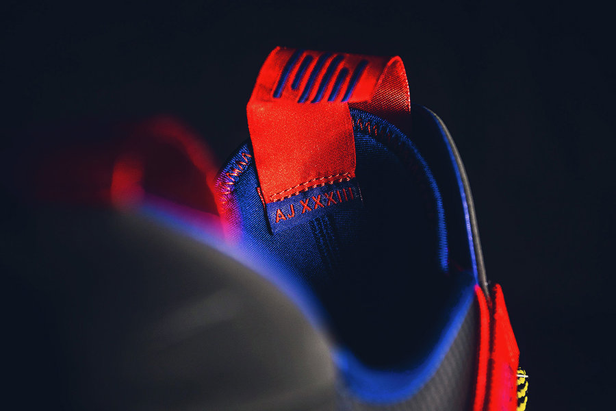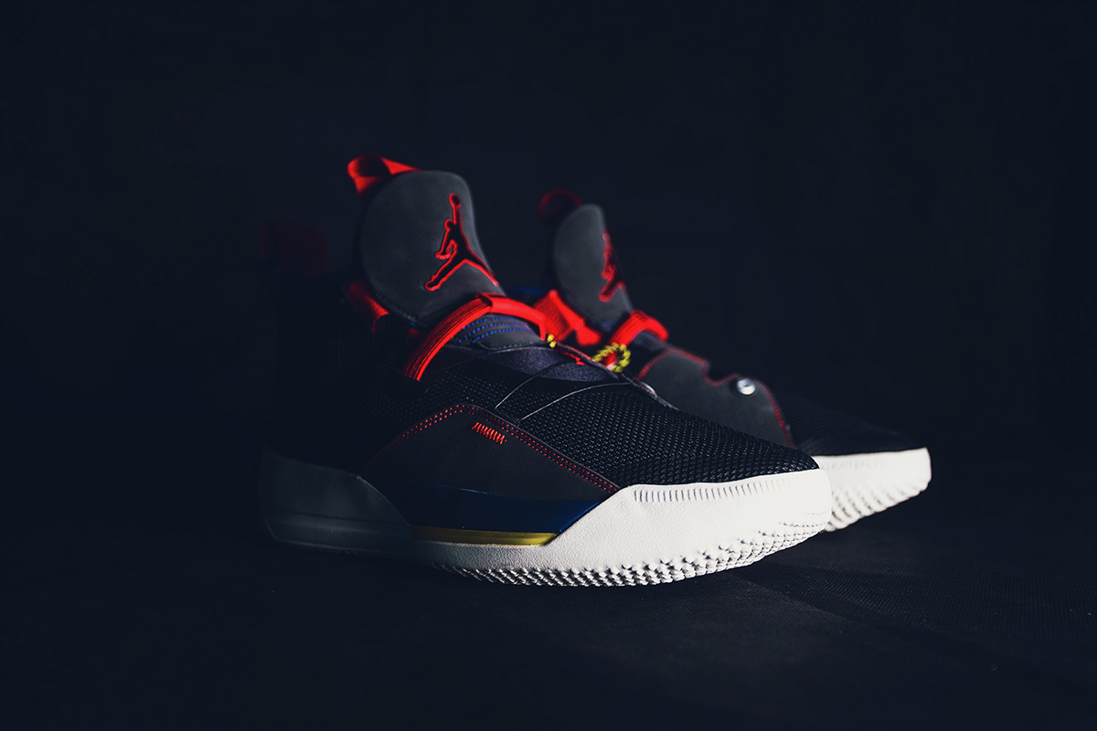 与 Air Jordan 30 之后的正代相同,Air Jordan 33 同样加入了经典的设计元素,像那些正代前辈们致敬。锁定系统的可视化设计,向最初的 Air 气垫开窗设计致敬;后跟所使用的 “Nike Air” 标志也是 Air Jordan 3、4、5 和 6 的体现;加大的鞋舌是放置 Jumpman 的最佳位置,正如汀克·哈特菲尔德在 Air Jordan 3 上初次亮相这个标志一样。