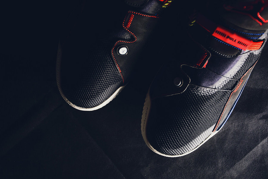 2.只需简单地拉起位于鞋面的扣环,便会带动球鞋内部系统收紧缆线,实现360度全方位的双足锁定