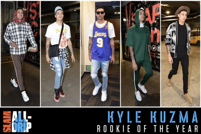 上赛季表现可圈可点的湖人新秀 Kyle Kuzma,则将 “年度着装最佳新人” 收入囊中!今年有了老大詹姆斯罩着,Kuzma 上脚球鞋越来越精彩。