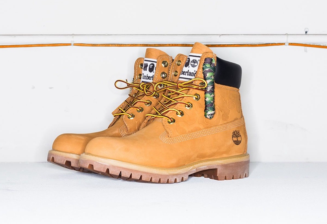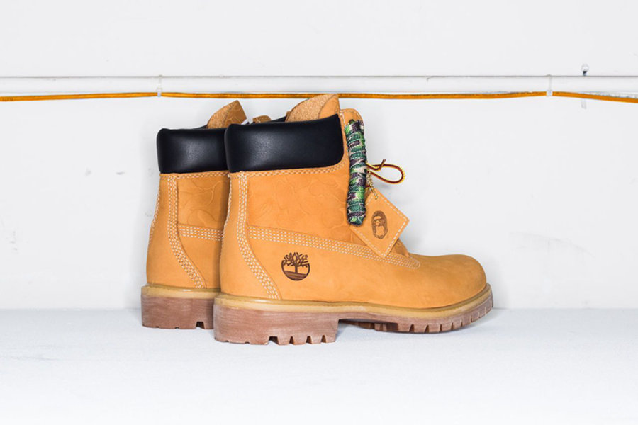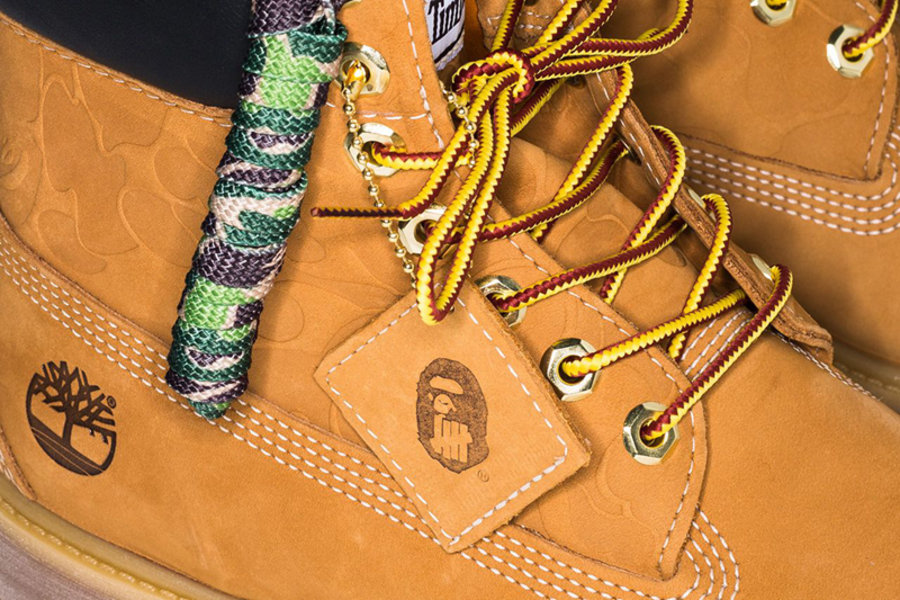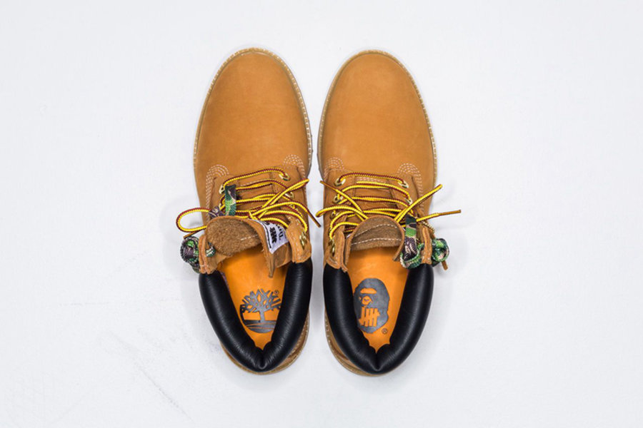 整体鞋型、颜色和用料都是最经典的大黄靴设计,在鞋帮部分的皮料上烫印有 BAPE 招牌的迷彩暗纹,除了经典的原装鞋带,随鞋还附赠迷彩鞋带,可以打造更具 BAPE 特色的造型。