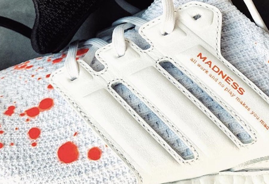 从鞋面编织纹理可以看出此次选用的是最新的 Ultra Boost 4.0 鞋型,与普通版不同的是三道杠支撑部分以皮革材质包裹,展现出更高规格,其上印有 “MADNESS” 及六叔文身 “all work and no play makes you mad”,彰显联名身份。
