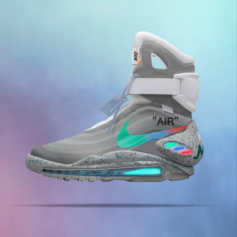将 Virgil Abloh 标志性 “AIR” 字体注入鞋身之上,近期刚刚发售的浅灰 OFF-WHITE x Air Max 97 与 Air Mag 素雅的气氛完美融合,彩虹 Nike Swoosh、大底透光 Air Max 气垫与 Air Mag 经典电源灯相呼应,营造出美轮美奂的未来科技感受!