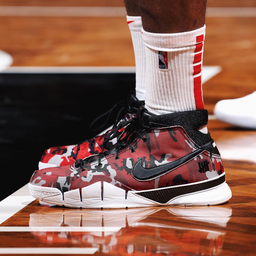 随后塔克还更换了一双红迷彩配色 UNDFTD x Kobe 1 Protro,虽然同样稀有,价格也在 300 美元以上,但算是塔克的鞋里比较质朴的一款了。