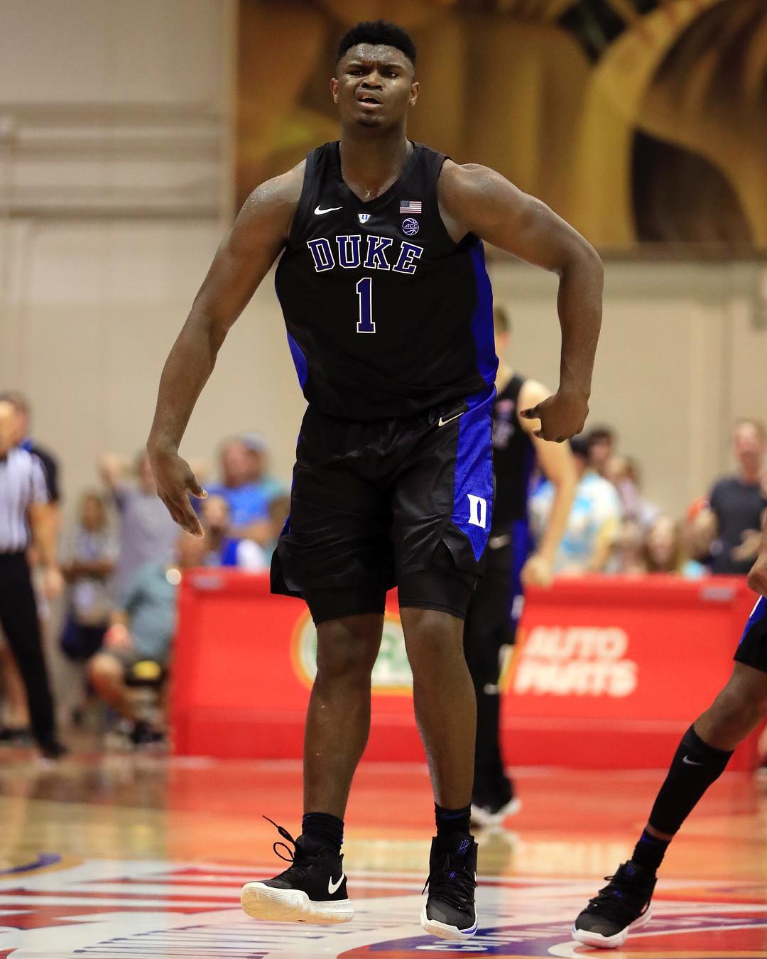 Duke 大学的当家球星 Williamson,被视为 2019 年 NBA 选秀的状元热门人选之一,在近日就上脚黑色版本 Kyrie 5 Duke PE 征战球鞋。