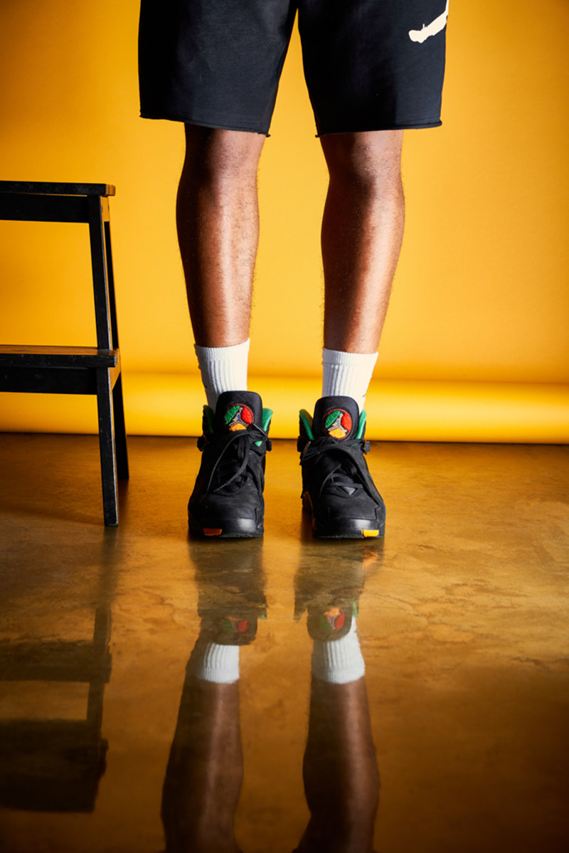 配色灵感来自于 Tinker 设计的经典鞋款 Air Raid II,与 Air Jordan 8 同样拥有交叉绑带设计。鞋身以纯黑色为主色调装扮,鞋面使用麂皮和 Air Raid II 标志性的尼龙布打造,带来户外球鞋的粗犷耐用风格。