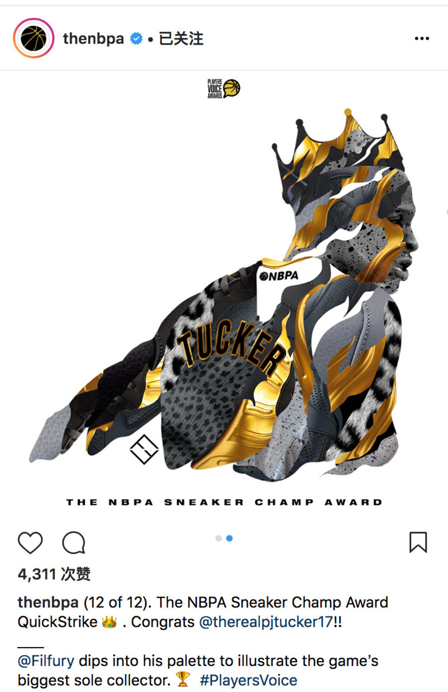 其实塔克 “鞋王” 的称号并不是空穴来风,上个赛季结束后 NBPA(美国国家篮球协会球员工会)通过投票给 P.J. 塔克 授予了 2017-18 赛季 “Sneaker Champ” 称号,名副其实的官方认证。