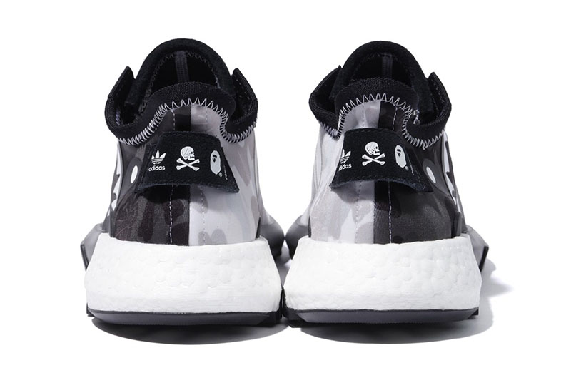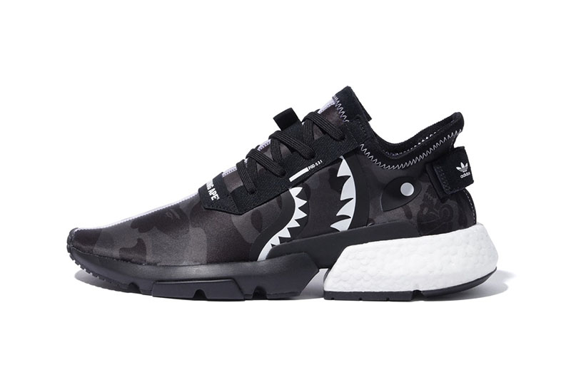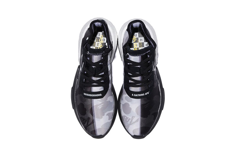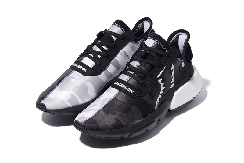 其中 NHBAPE® POD S-3.1 鞋面采用黑白阴阳迷彩设计, 将 BAPE® 经典 1st 原始迷彩与 NEIGHBORHOOD® 骷髅骨暗花相结合,鞋身保留 adidas 经典三线并注入 BAPE® 鲨鱼细节,散发不凡的吸睛表现。