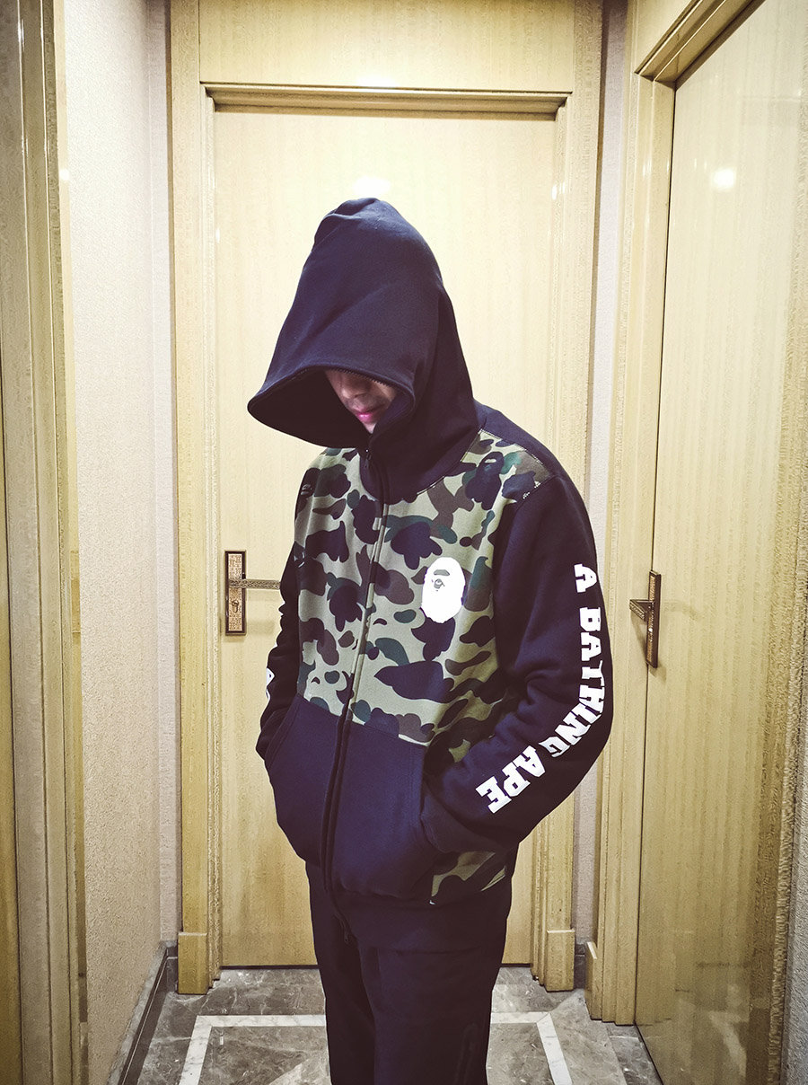 所以,¥3599 RMB 的迷彩背包里,不仅有冲锋衣和 T 恤,还有一件迷彩装扮的拉链连帽卫衣。