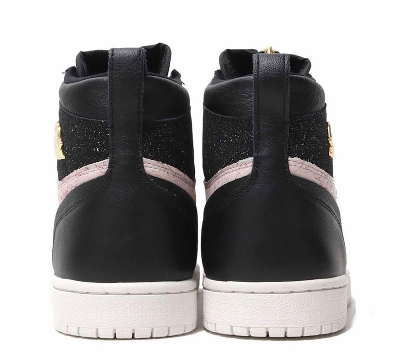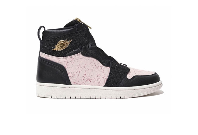 这款 Air Jordan 1 以黑色为主调,侧面覆盖着粉红色大理石纹图案,值得一提的是鞋身上还包裹着三块有金色泼墨点缀的特殊皮革,搭配上金色的拉链以及后跟的 Logo 可谓个性十足。