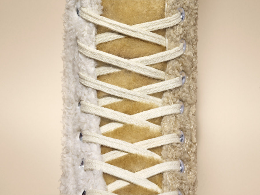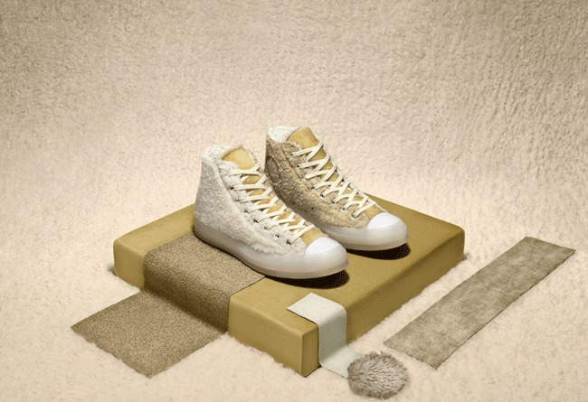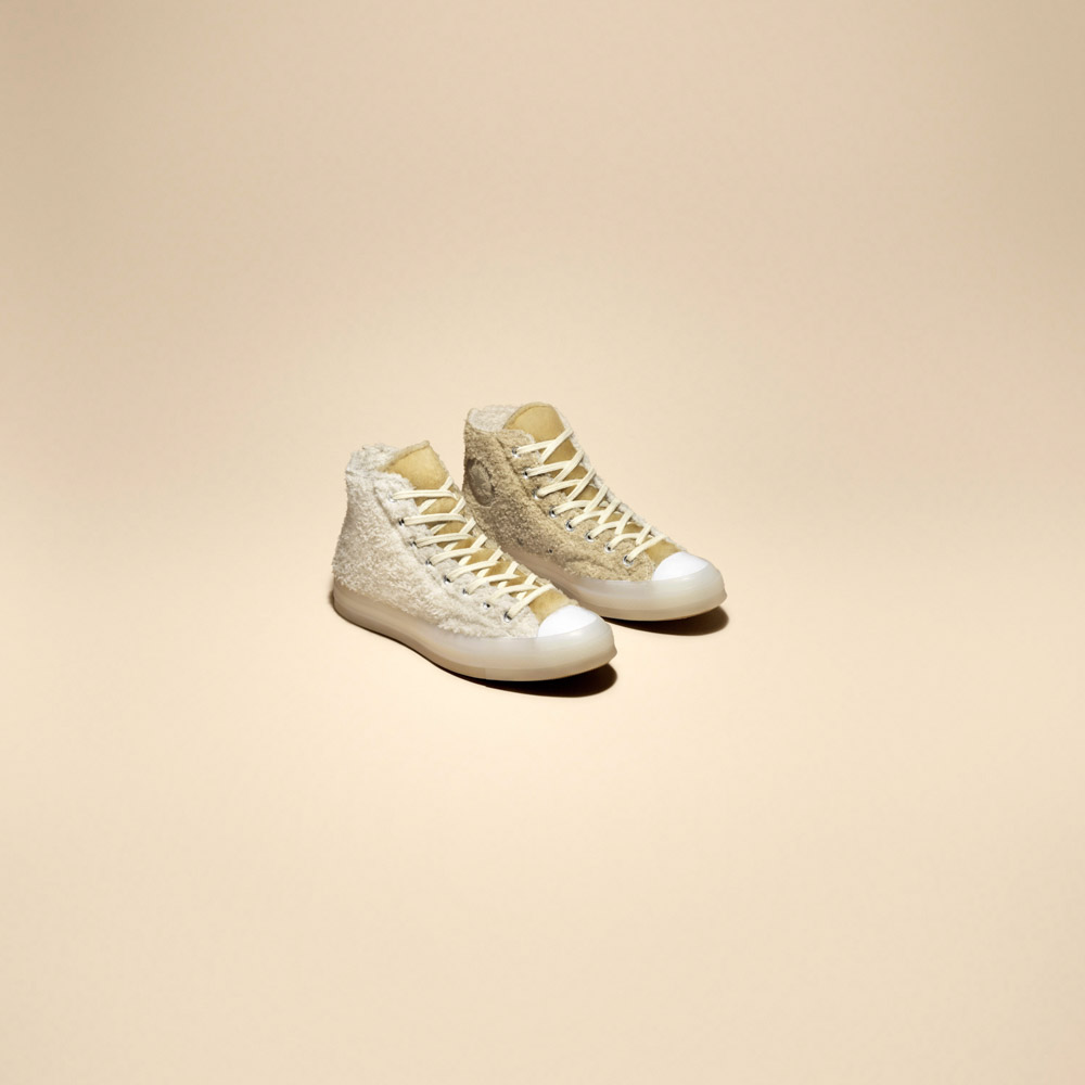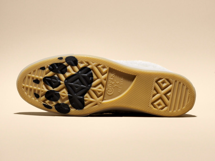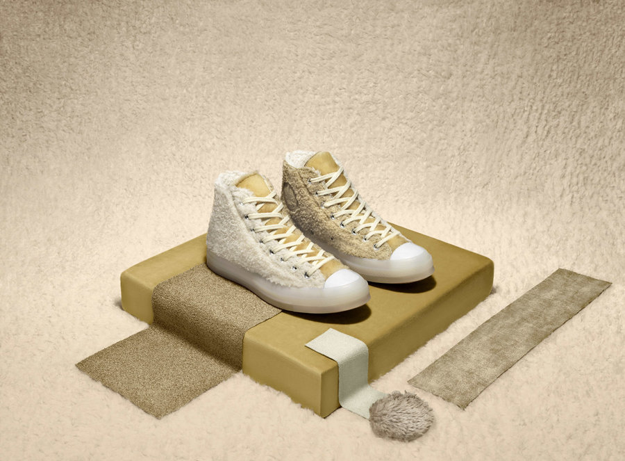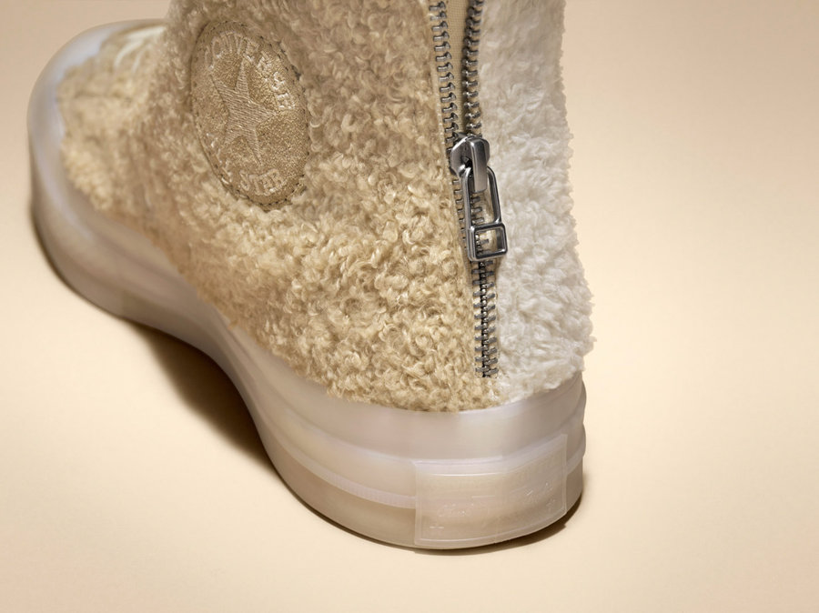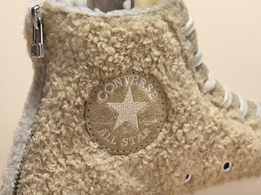 其中 Chuck 70 以北极熊为灵感,鞋身以类似北极熊毛的绳绒面料打造,鞋舌则换上羊毛材质,考究的物料选择彰显此次高规格联名,同时在后跟处加入拉链设计穿脱更加便捷。
