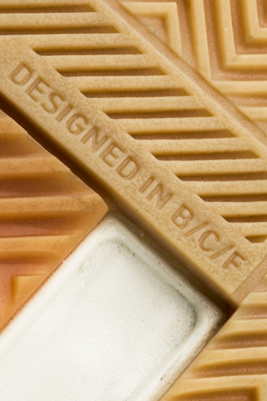 并刻有一个地理坐标,与前掌纹理中镶嵌的 DESIGNED IN B/C/F 文字相呼应,彰显源于布鲁克林创意农场的独特身份。