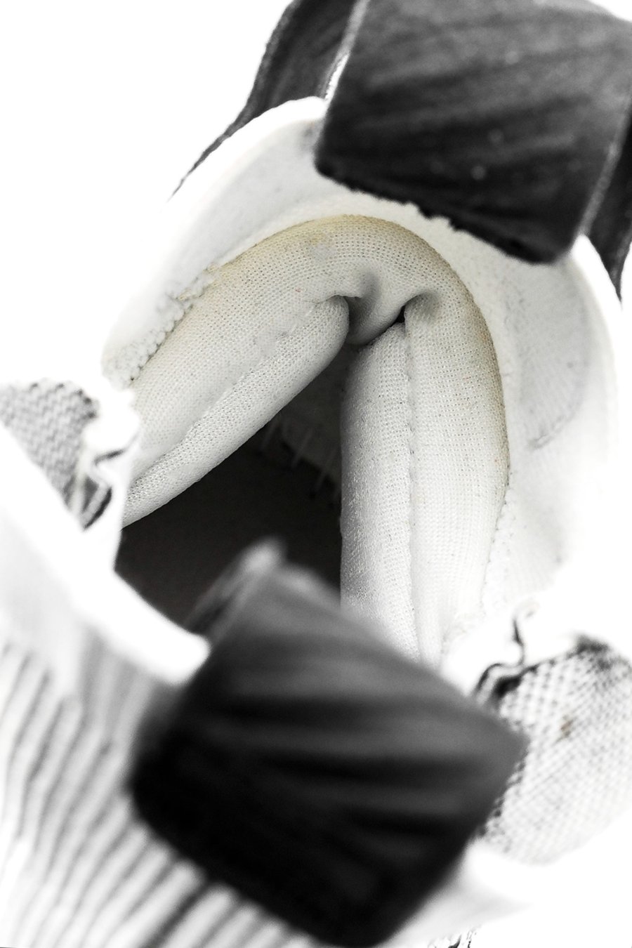 贴合跟腱的部位进行了海绵填充,图中可以看出用料非常足,角度预留也非常合理,上脚后非常舒适。并特别进行了防滑处理,能够锁紧跟腱。不过也有个小小的缺点,就是容易粘上袜子的毛线。