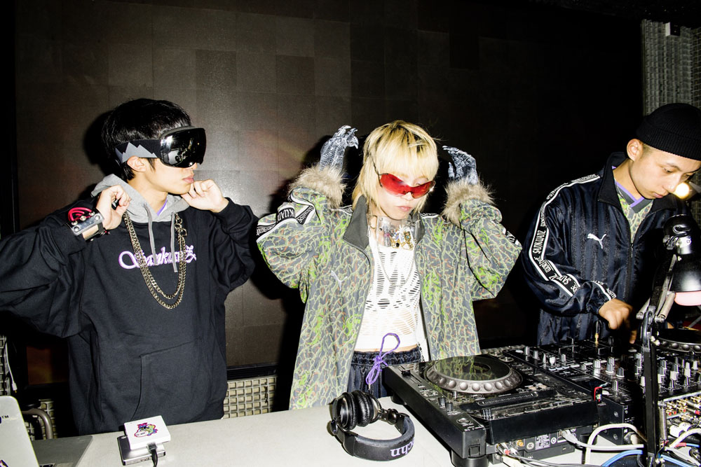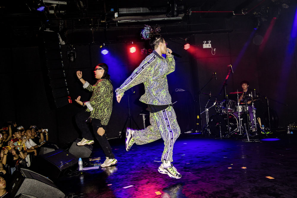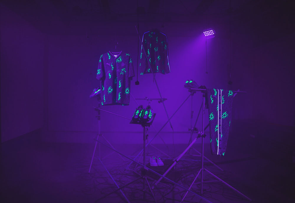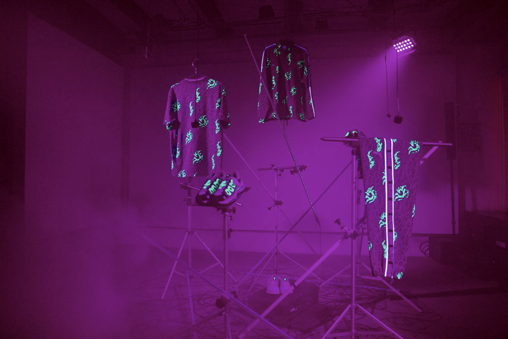 衣服上遍布 SANKUANZ 的特殊徽章图案,同样能在紫外灯的照射下发出耀眼的夜光效果。