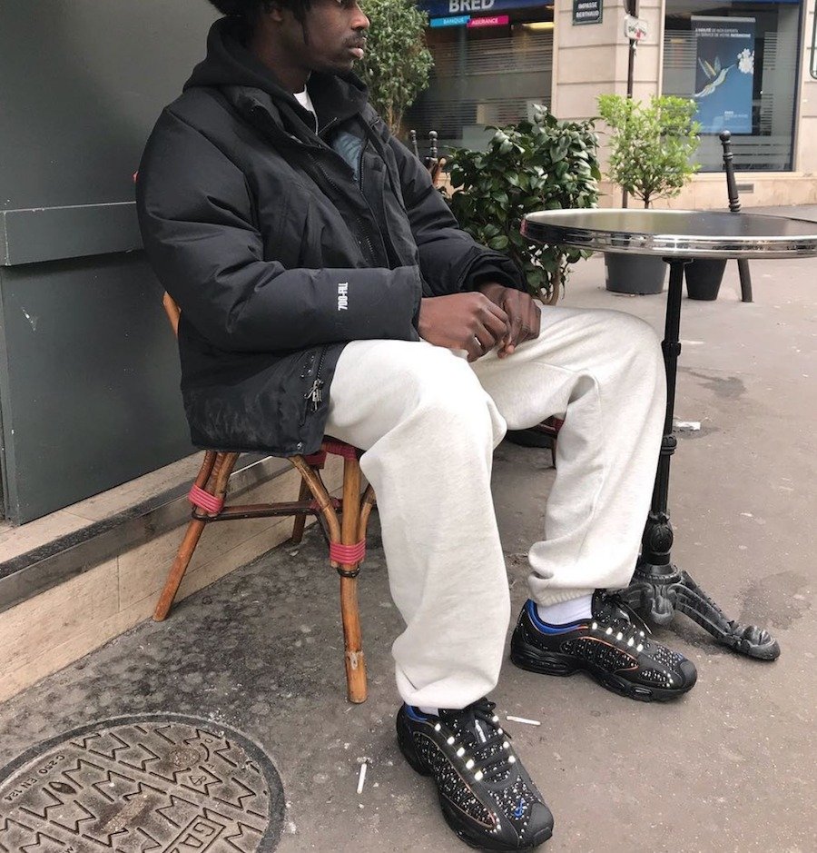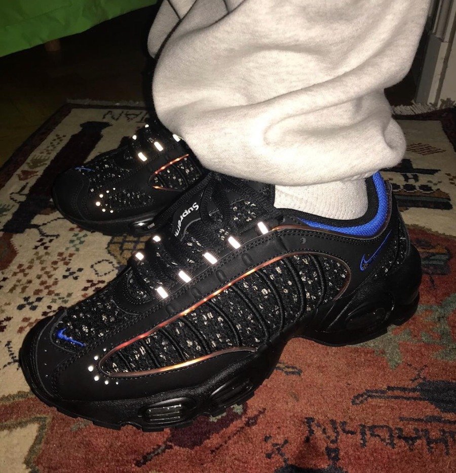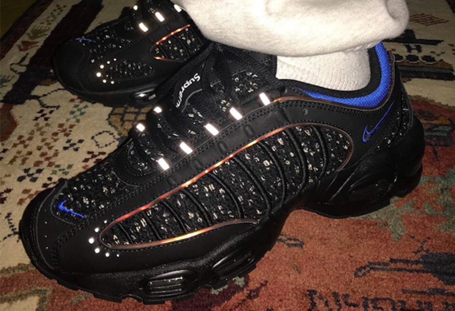 大面积的黑色鞋面上,布满银色刺绣,同时加入蓝色点缀,鞋舌上的 Spureme Logo 极为醒目,如今大火的 3M 反光材质也装饰在鞋带两侧。