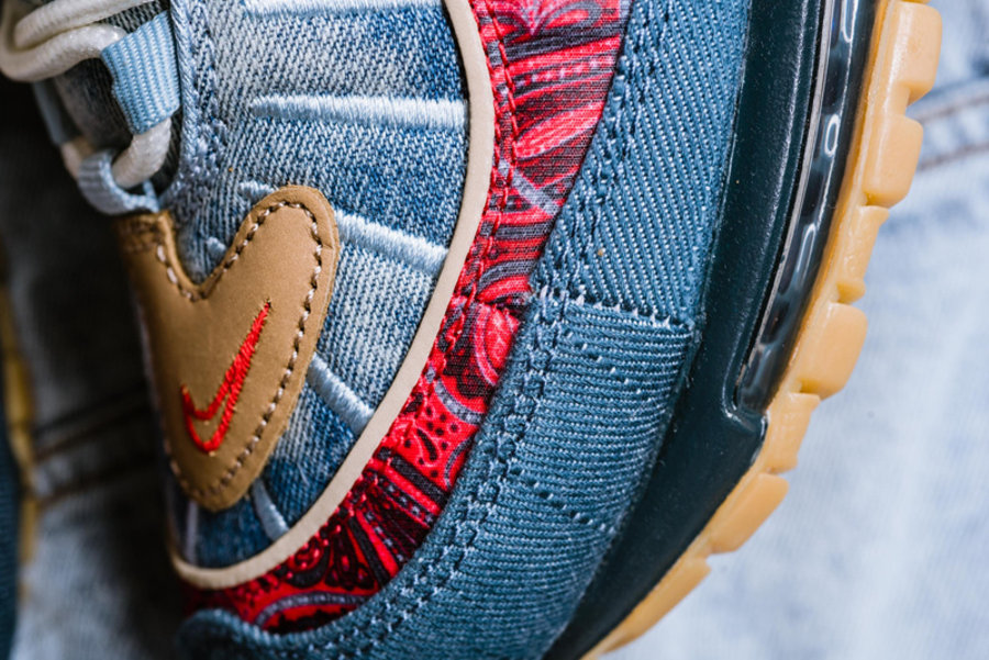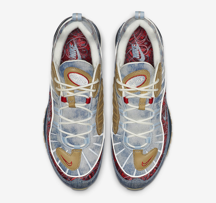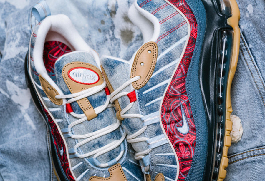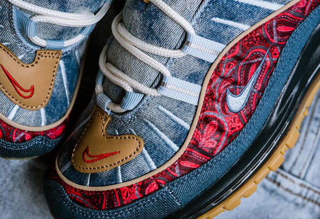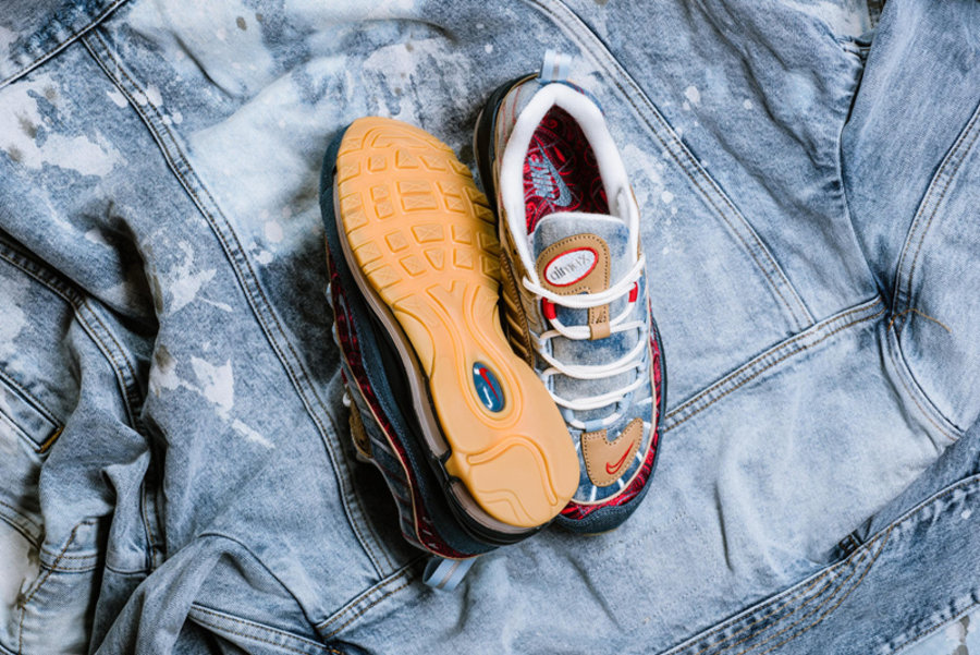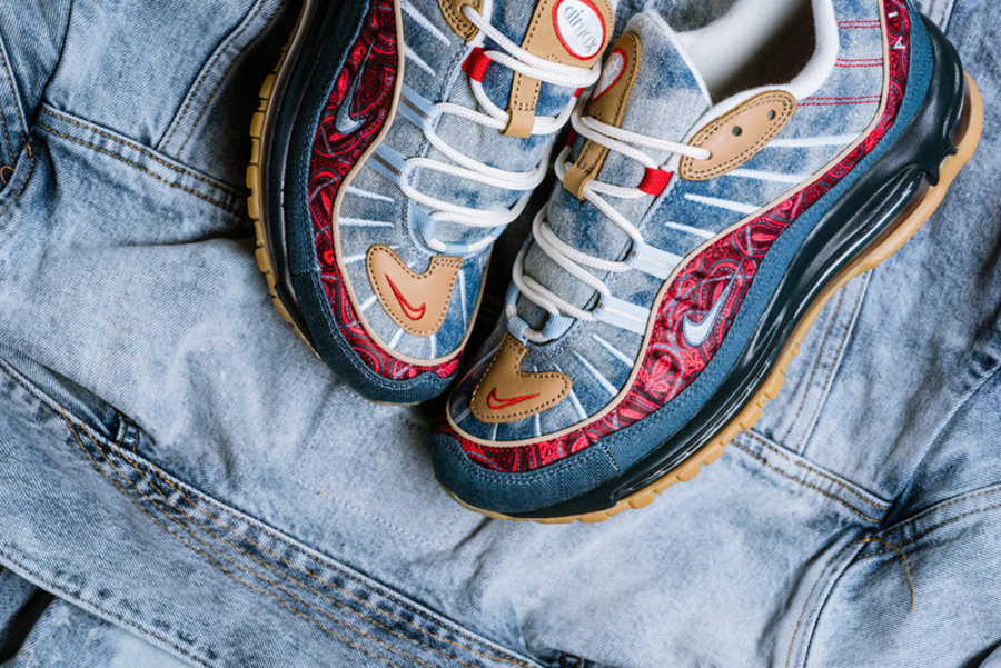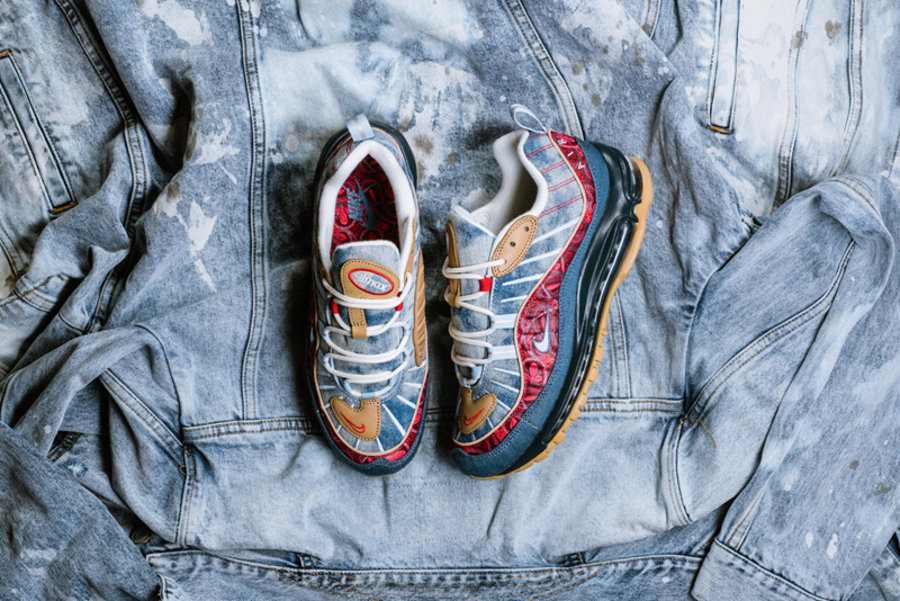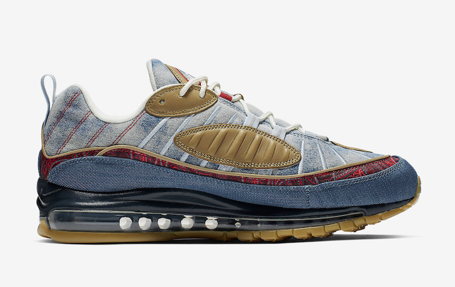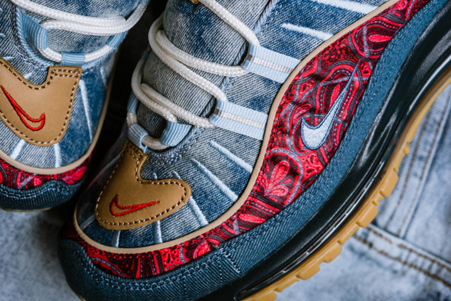 区别于过往发售的复古配色,眼前这双 Air Max 98 分别以扎染牛仔、腰果花以及大量生胶色细节点缀。将近年来流行的街头装扮与经典鞋款完美结合,视觉层次极为丰富,绝对是近期球鞋市场的潜力股。