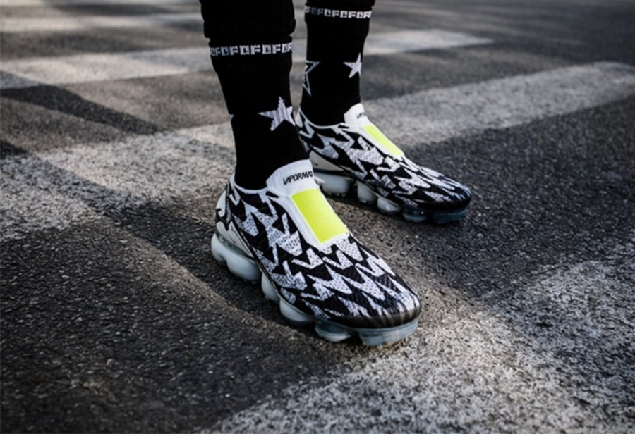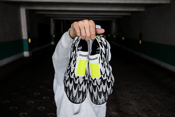 以 Nike Vapormax Moc 2 为蓝本,将舒适透气的 Flyknit 鞋面,换上了一件视觉冲击力极强的黑白外衣。而鞋舌和后跟的荧光绿点缀,又注入不凡活力。
