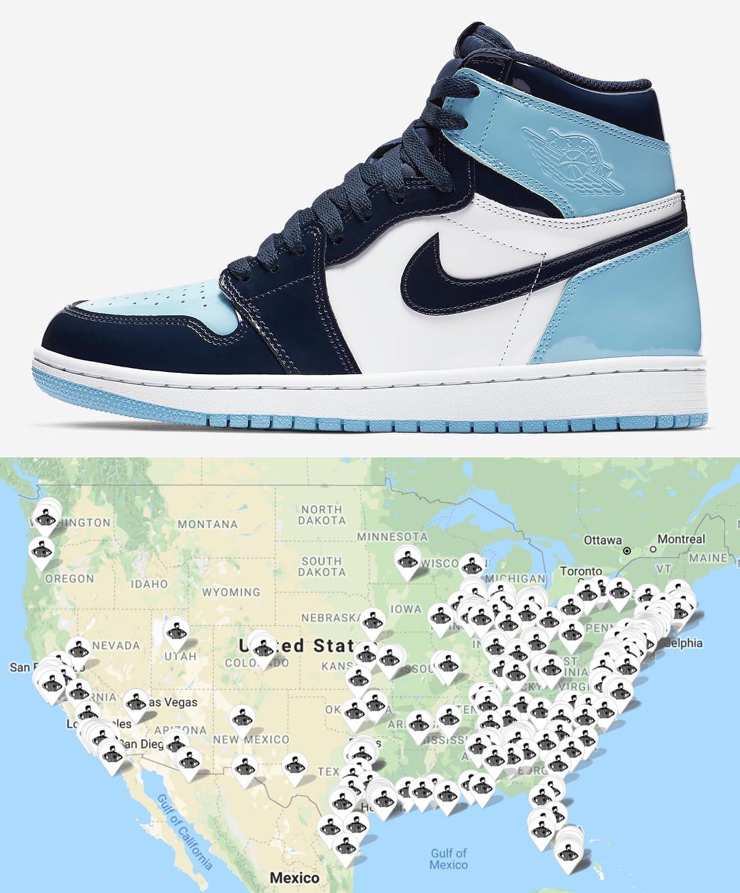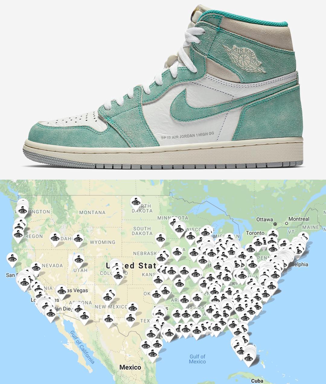 本月 Air Jordan 1 “TurboGreen” 和 Air Jordan 1 “UNC” 即将陆续在美国发售,知名球鞋爆料博主 zsneakerheadz 近日曝出这两双鞋在美国的发售店铺分部图。