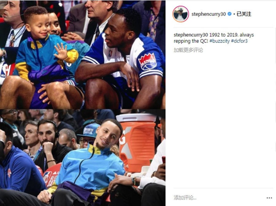 而今日库里现身场边观看比赛也上身了同样装扮的夹克外套,并在个人 ins 上附言 “1992 to 2019”,溢出满满的回忆。