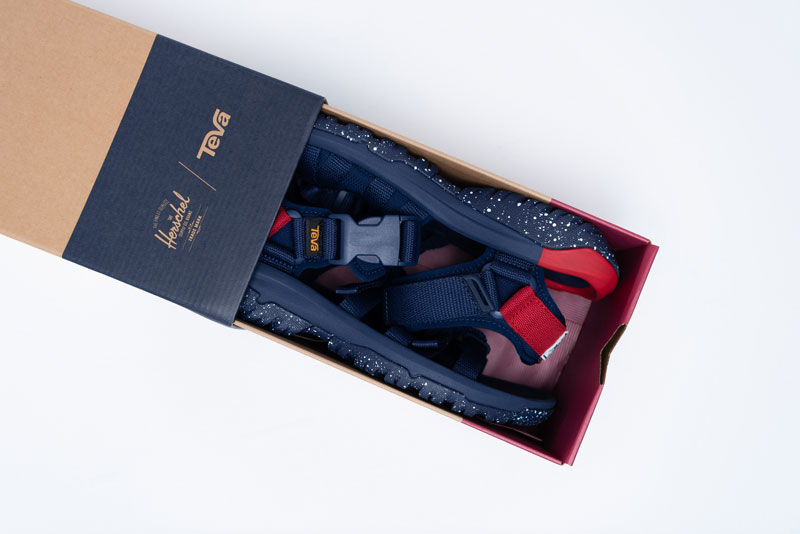 这一款限量版凉鞋都附赠与众不同的海军蓝和红色双色抽绳鞋袋,搭配印有联合品牌名的抽屉式鞋盒,鞋盒内衬则是 Herschel Supply 标志性的红白条纹设计,极具复古的美式风格。