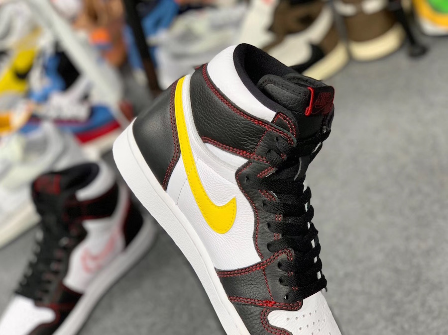 仅有左脚内侧缝上了黄色 Swoosh,其他几个 Swoosh 的位置都空空如也,似乎是被拆掉了一样,仅留下红色线头勾勒出 Swoosh 的轮廓。鞋面其他部分也使用红色车线,带来独特线条设计。