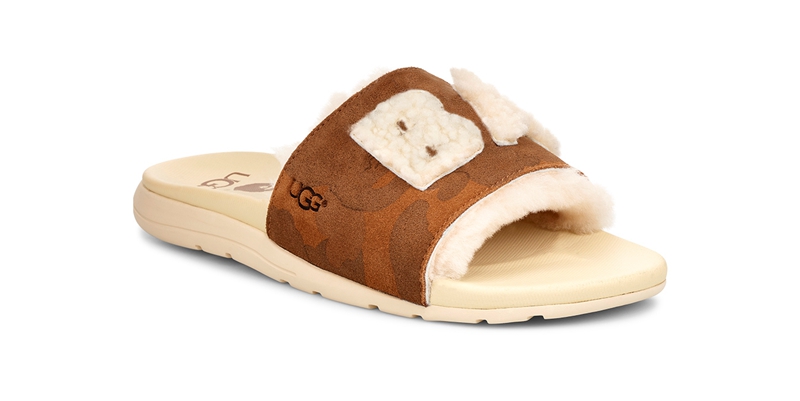 联名拖鞋使用软羊皮材质,同样采用棕色为主色调,鞋面上醒目的品牌字母标识,彰显着鞋款的不凡,两款鞋都采用了 UGG 特有的 Treadlite 轻翼科技大底,让鞋款更加轻便耐磨。