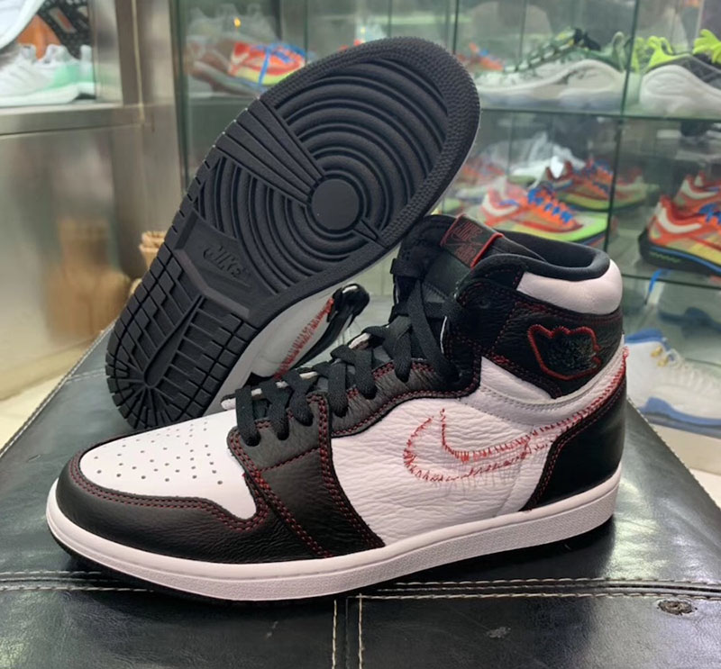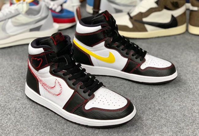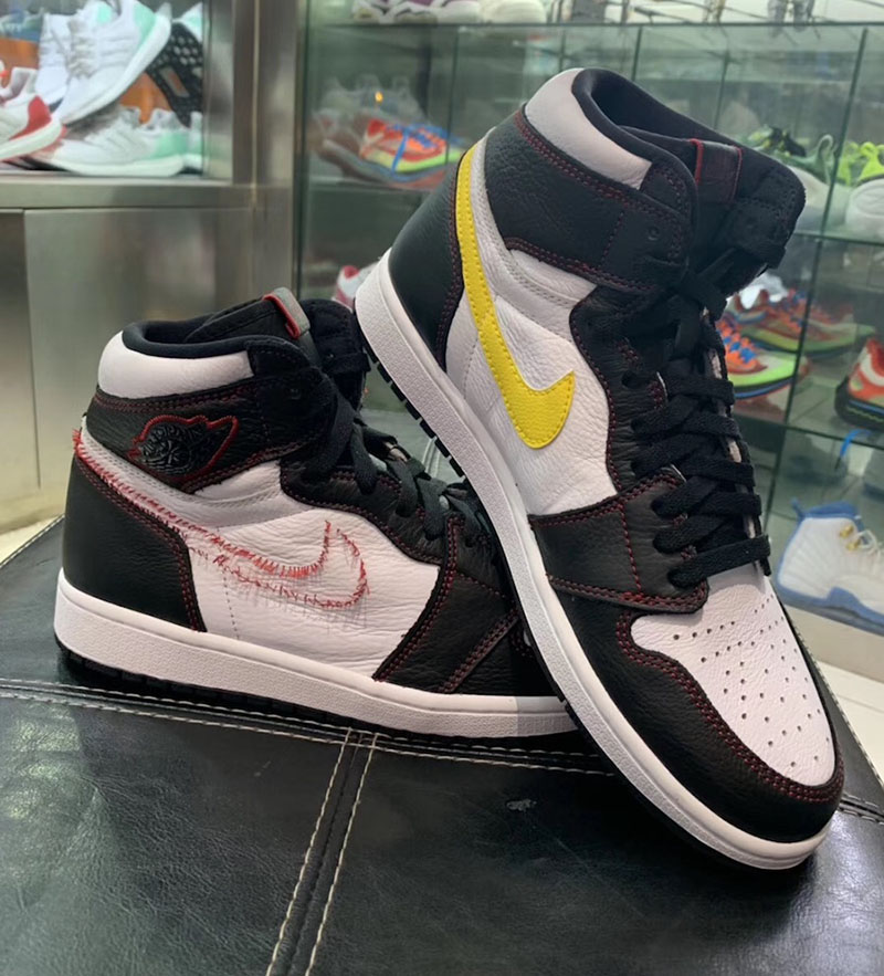 眼前这双 Air Jordan 1 “Dynamic Yellow” 主体以简约的黑白撞色示人,最大亮点在于仅有左脚内侧缝上了黄色 Swoosh,其他几个 Swoosh 的位置都空空如也,似乎是被拆掉了一样,仅留下红色线头勾勒出 Swoosh 的轮廓。
