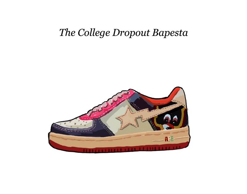 以 《 THE COLLEGE DROPOUT 》 推动着嘻哈音乐迭代的 KANYE WEST 与如日中天的 NIGO 成就了这双在 STOCKX 上售价高达 4750 美金的 BAPESTA 。