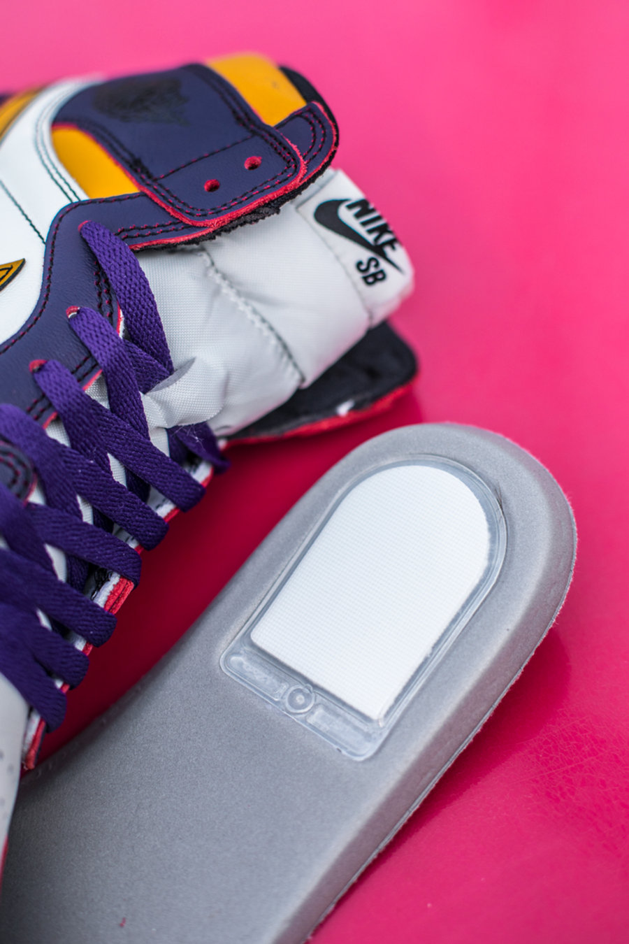 设计上与 Air Jordan 1 没有明显区别,但细节中还是与经典的 Air Jordan 1 有几处细微差别,比如鞋舌上醒目的 Nike SB Logo 和鞋垫背面加入的 Zoom 气垫。