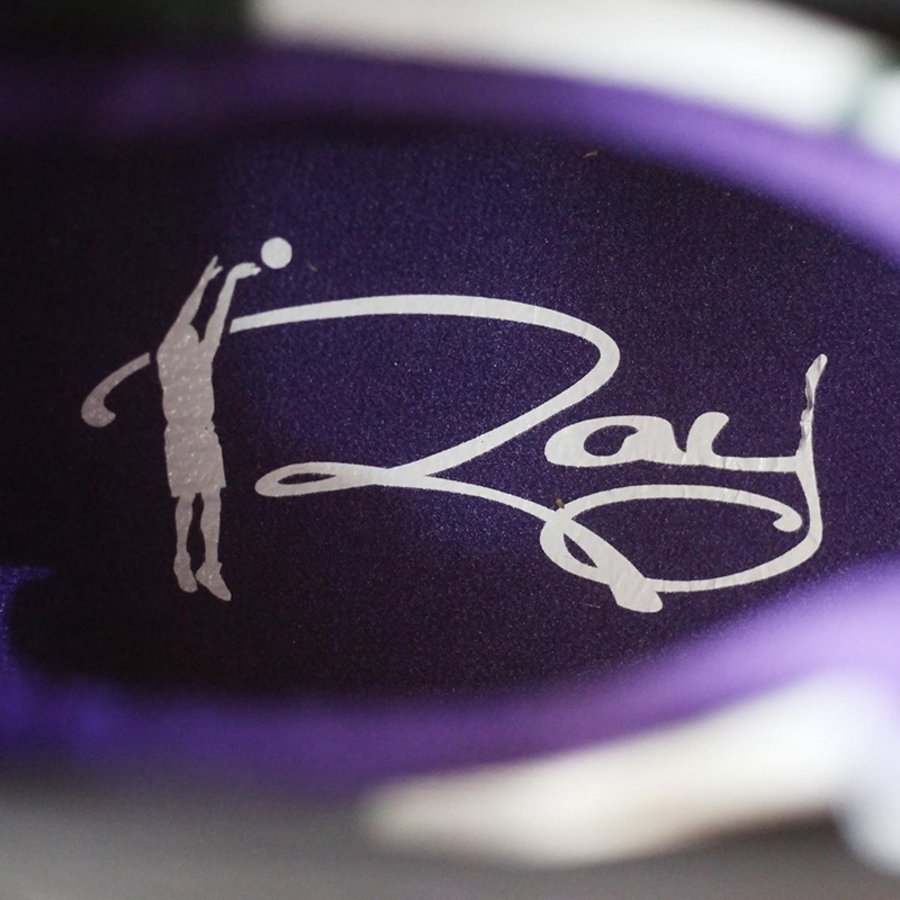 中底和外底分别以紫色和绿色点缀,鞋舌也以紫、灰、绿三色装扮,复古又炫酷。鞋帮绣有紫色 Jumpman Logo,并在鞋垫印有雷阿伦的个人 Logo,彰显出鞋款的特殊身份。