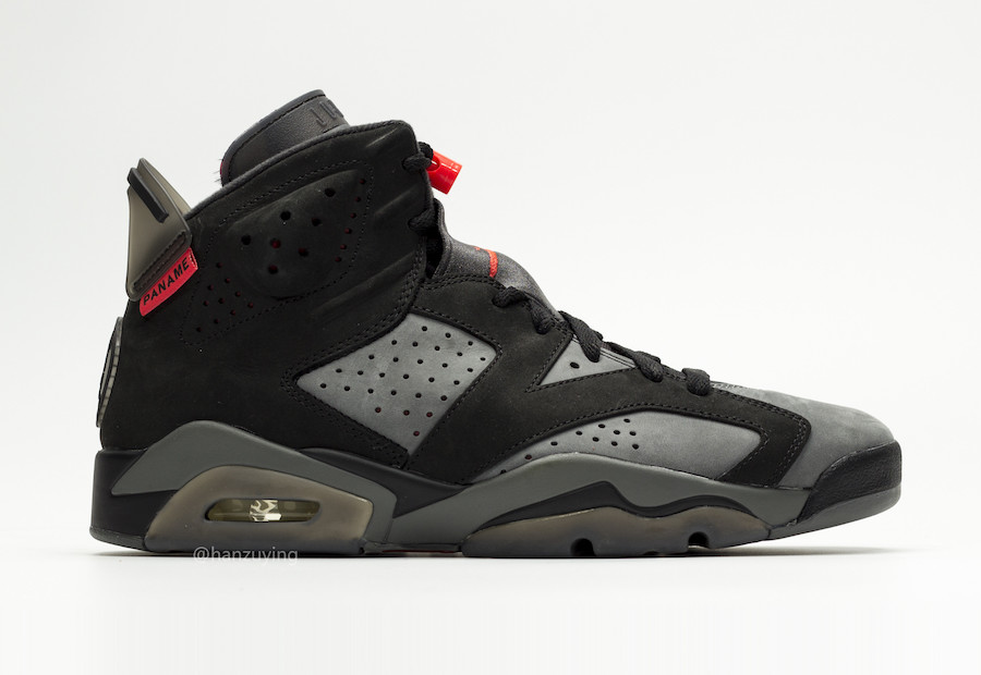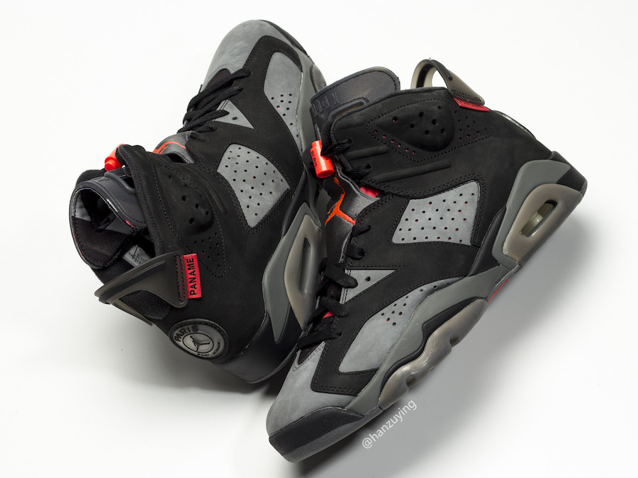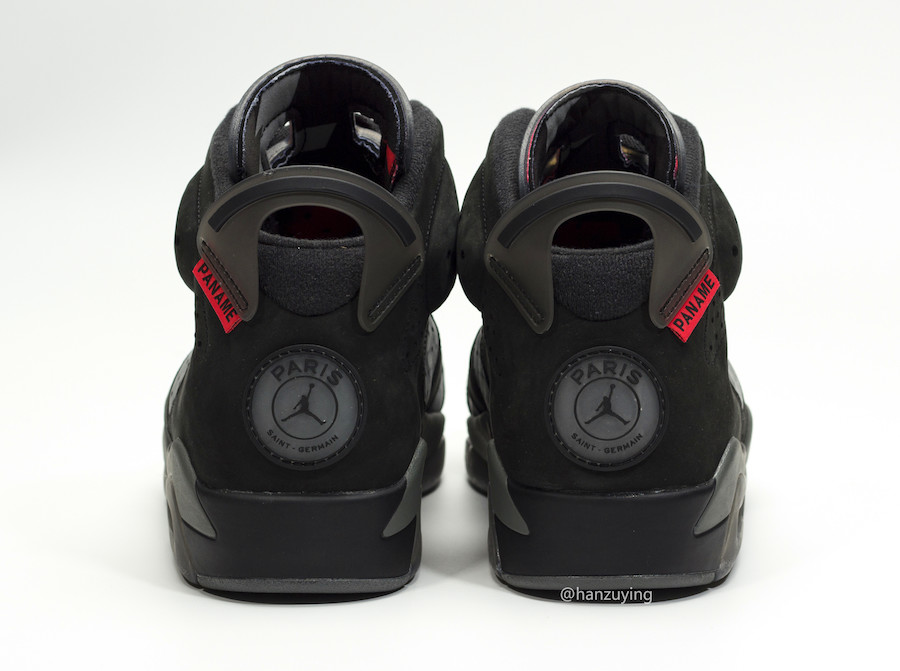 鞋舌 Jumpman Logo 刺绣及鞋带扣以经典的大红色点缀 ,鞋带扣上带有 Paris 字样,与鞋帮 PANAME 标签呼应,在暗色鞋身上显得非常抢眼。