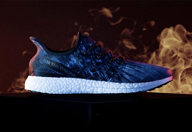以 adidas SPEEDFACTORY 鞋型为蓝本,轻量化构建的透气鞋身搭载覆盖全掌的 Boost 缓震科技。最大亮点在于鞋面采用各大家族争夺的铁王座为图案,后跟补强则点缀 「For The Throne」 字样,整体醒目又霸气非凡!