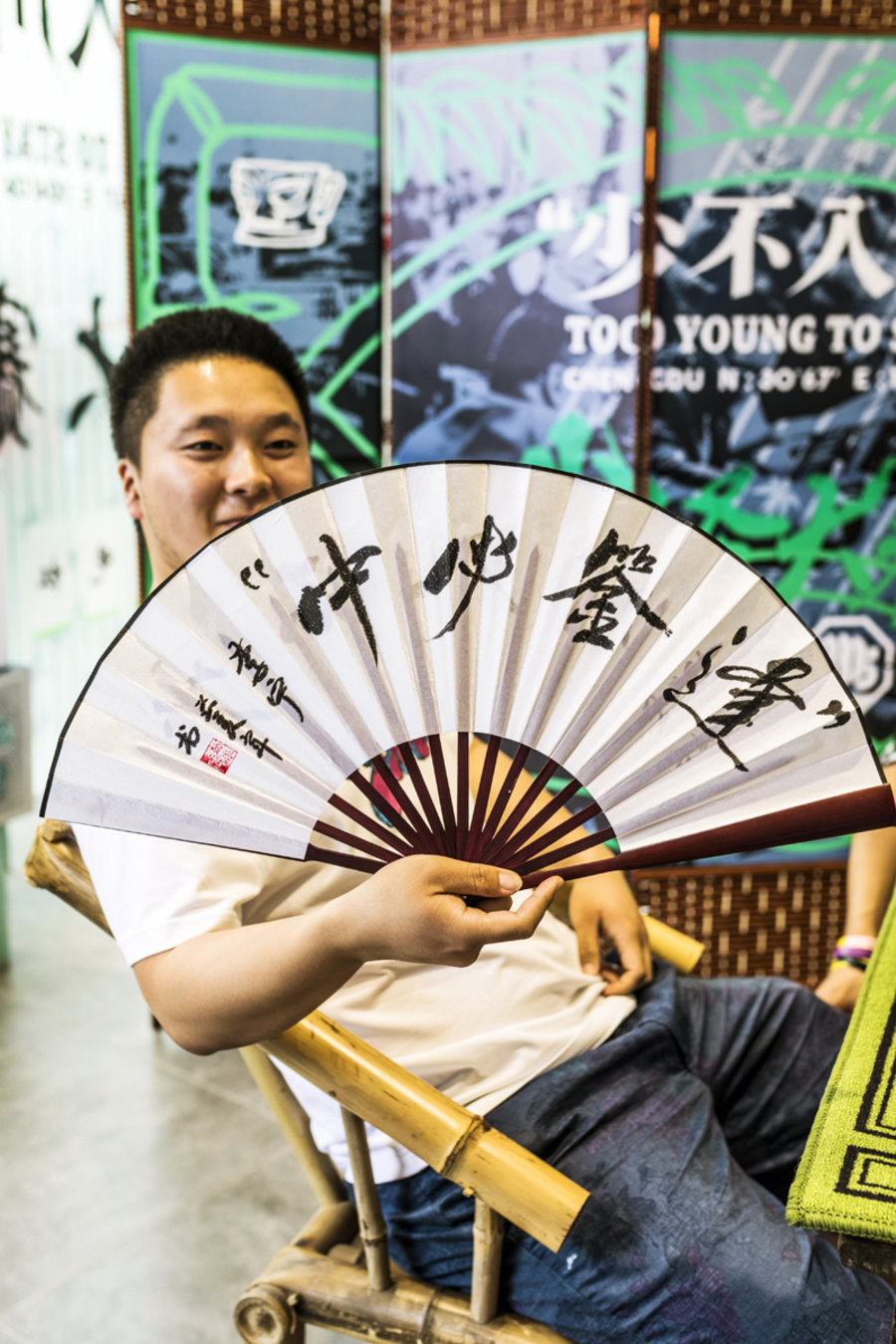 现场还有不少专属福利,消费者都会获赠折扇,更有机会获得现场定制的涂鸦 T 恤。
