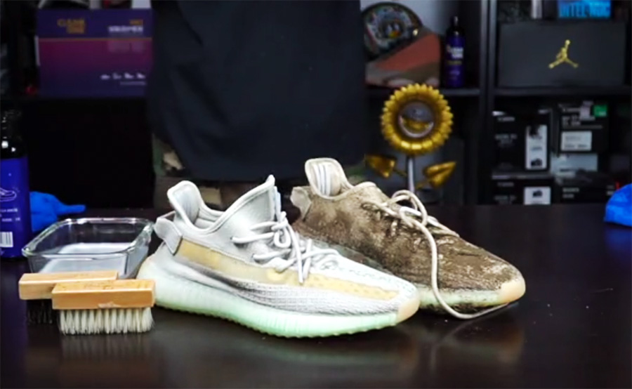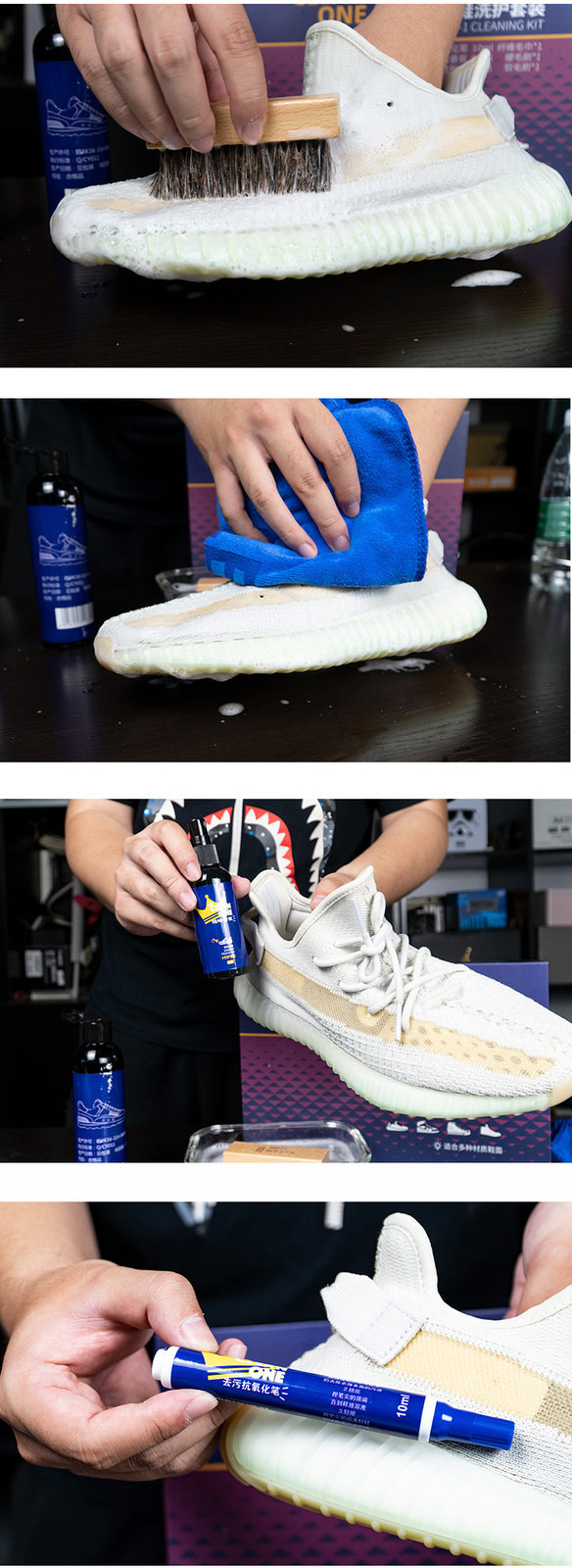 编织鞋面的纯白 Yeezy 350 V2 和皮革、织物鞋面的 Air Jordan 11 小编都洗过,效果显著,并且操作起来很简单。