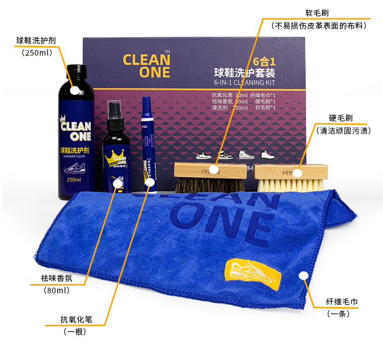 来自球鞋洗护品牌的 CLEAN ONE 是小编近期发掘的洗鞋装备,六合一套装里包含了清洗剂、软毛刷、硬毛刷、抗氧化笔、祛味香氛和纤维毛巾 6 个单品,而价格在 618 期间仅有 ¥79.9 RMB!可谓是超值!
