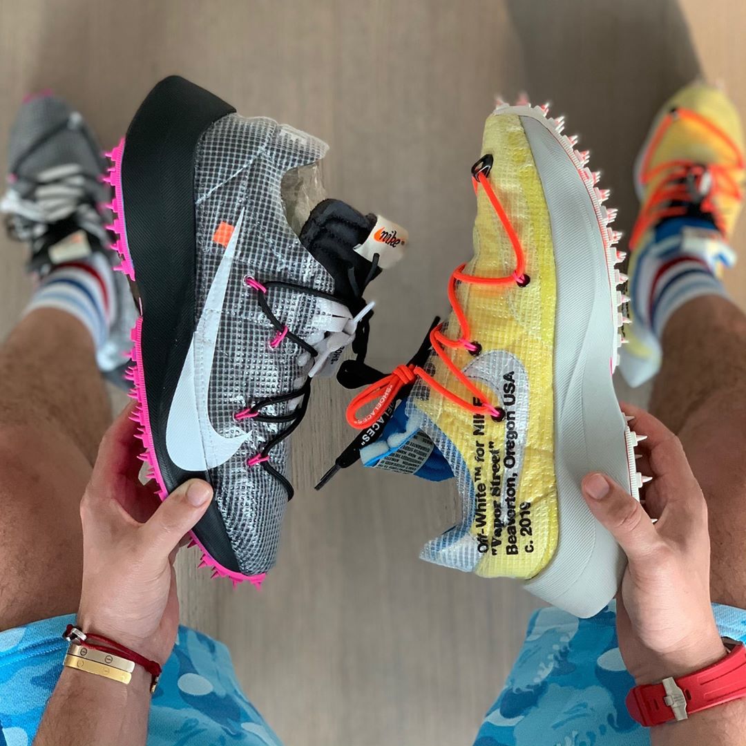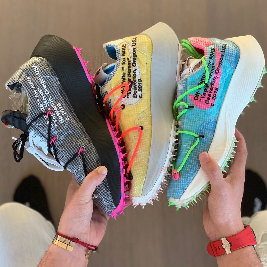 三款 OFF-WHITE 新品此前已经多次曝光,延续了 Vapor Street 的整体造型,融入橡胶尖钉外底设计。鞋面融合复古元素与标志性的蝉翼材质,带来新奇视觉效果。