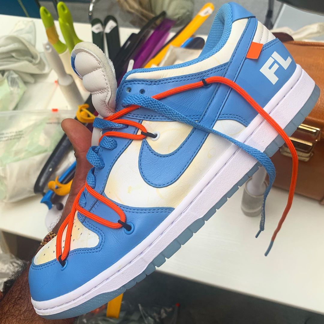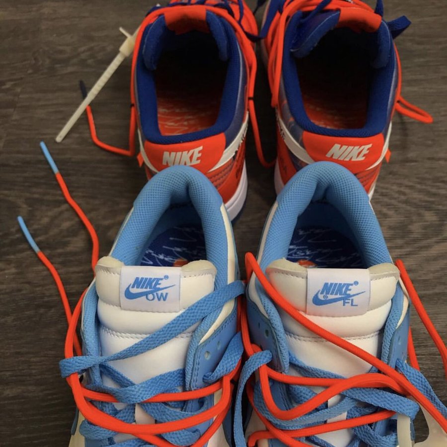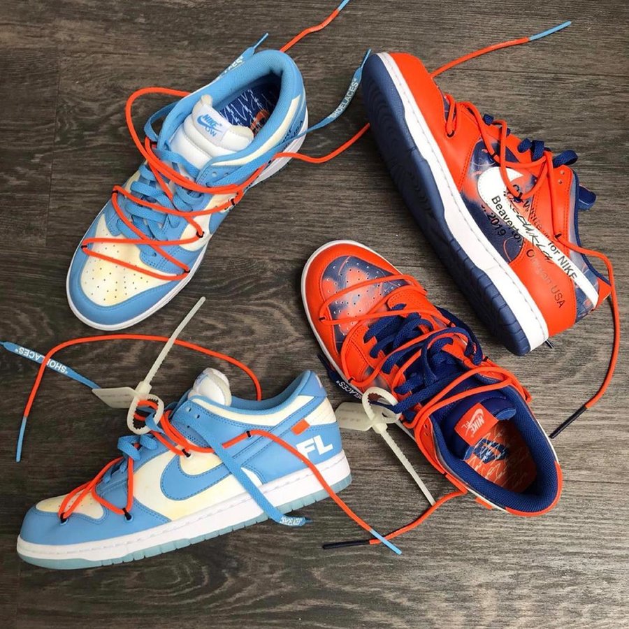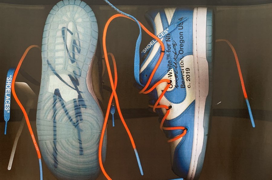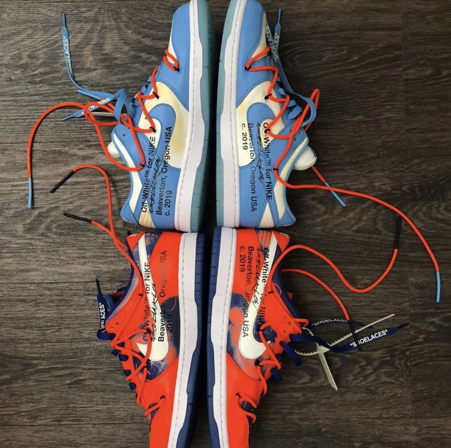 近日,主理人 Virgil Abloh 亲自晒出两双全新 OFF-WHITE x Futura x Nike Dunk 三方联名鞋款。