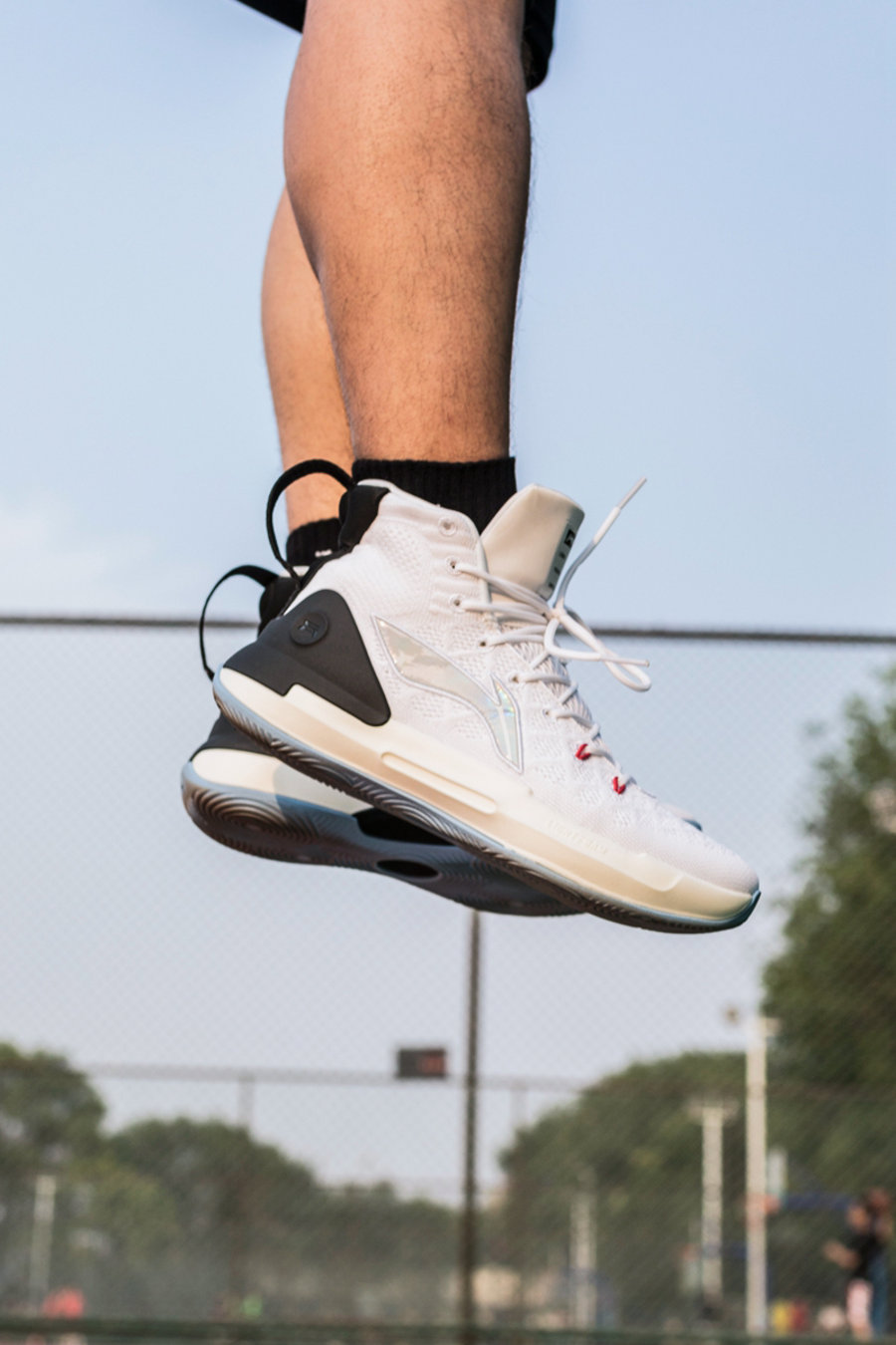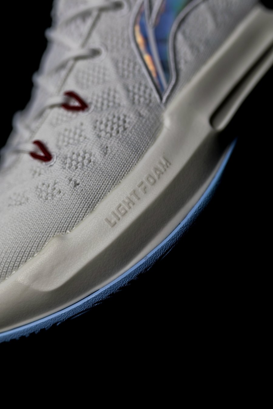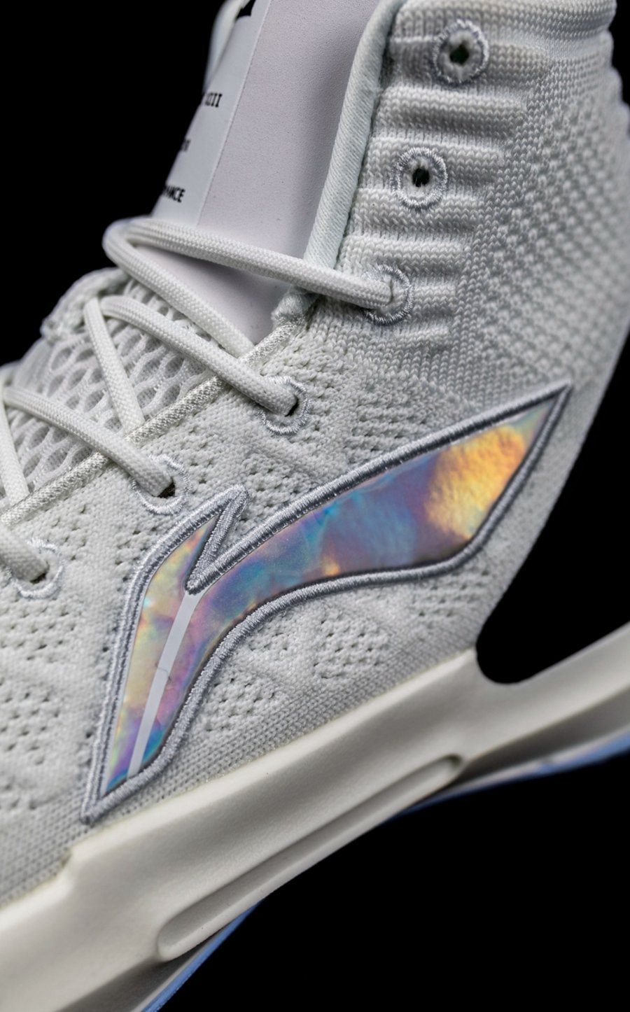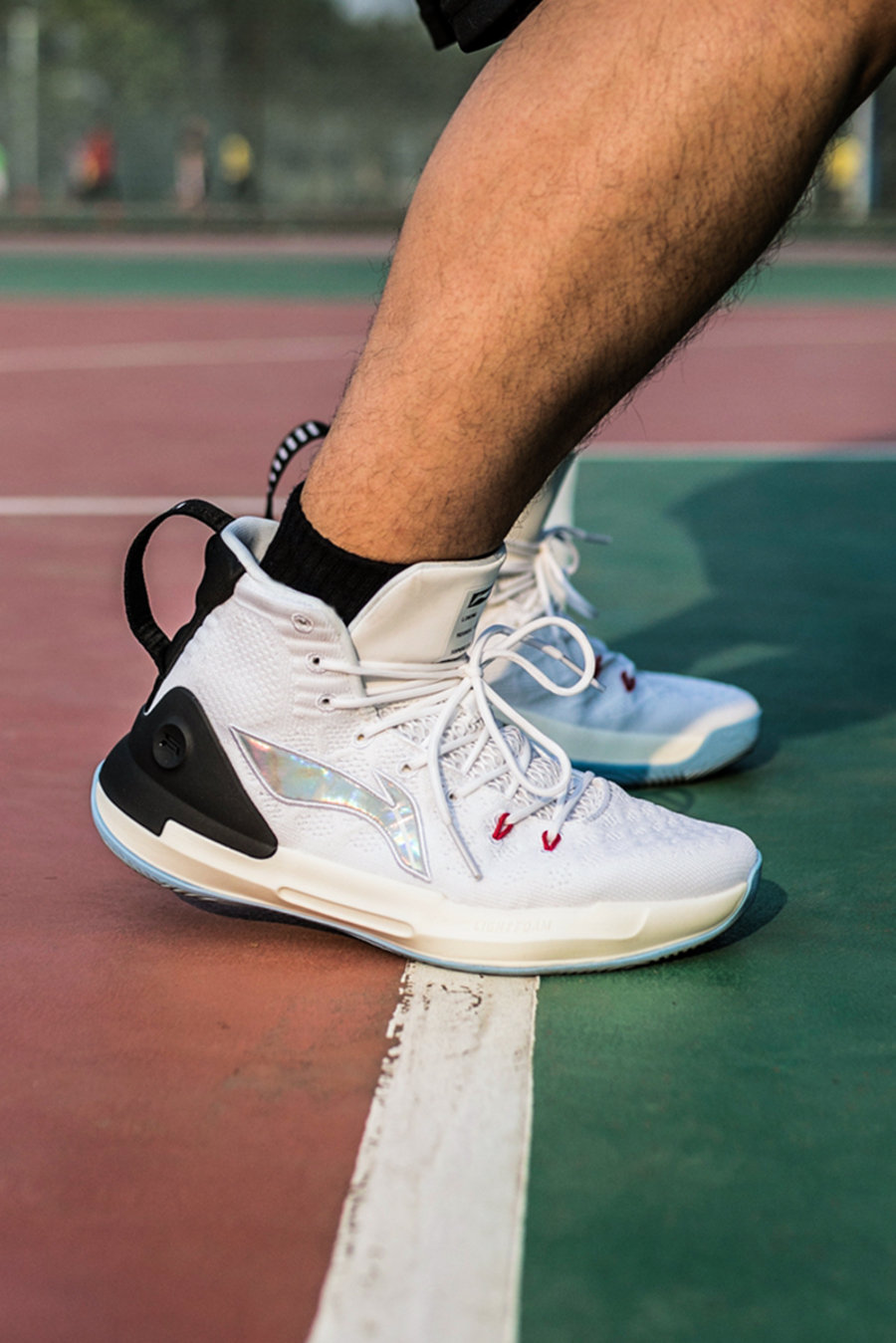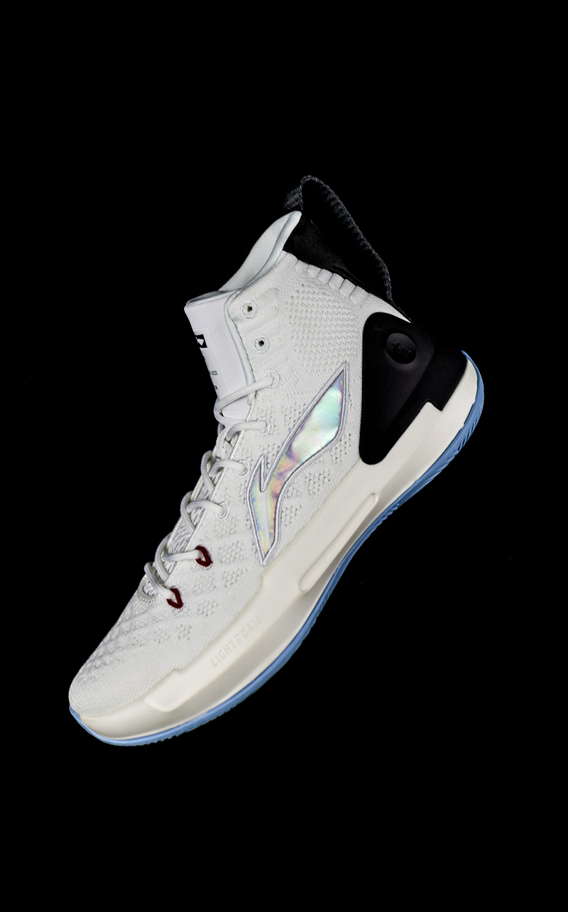 鞋身采用纯白色作为主色调,侧面辅以炫彩李宁 Logo 示人,搭配后跟黑色 TPU 点缀,配色简洁但外观却相当出众,带来实战鞋中难得的时尚气息。