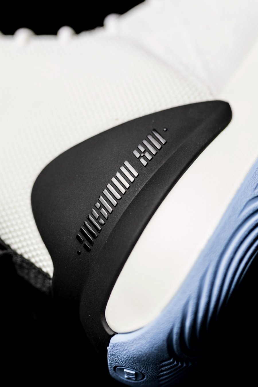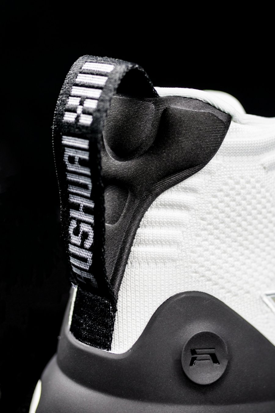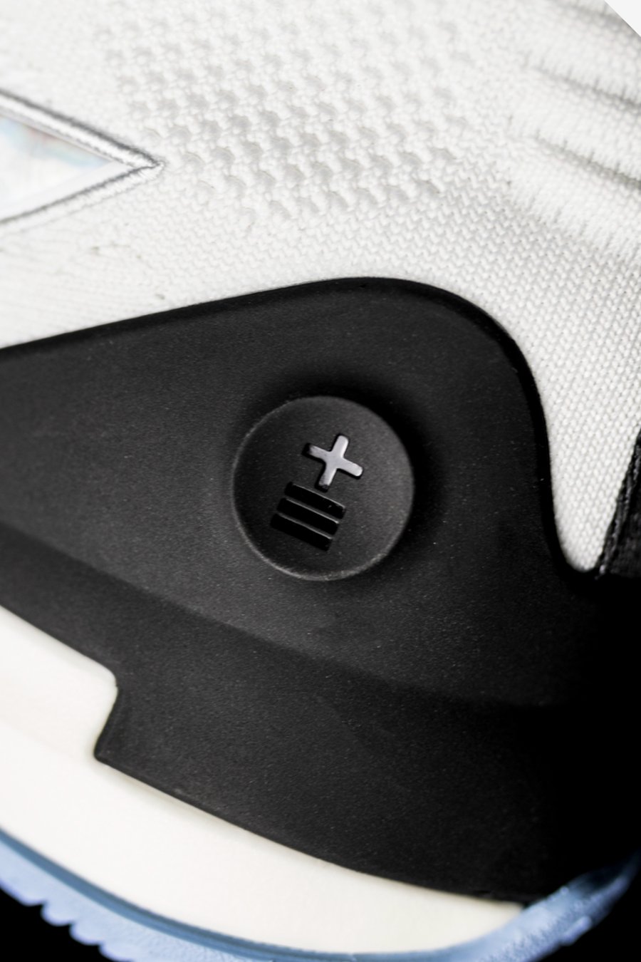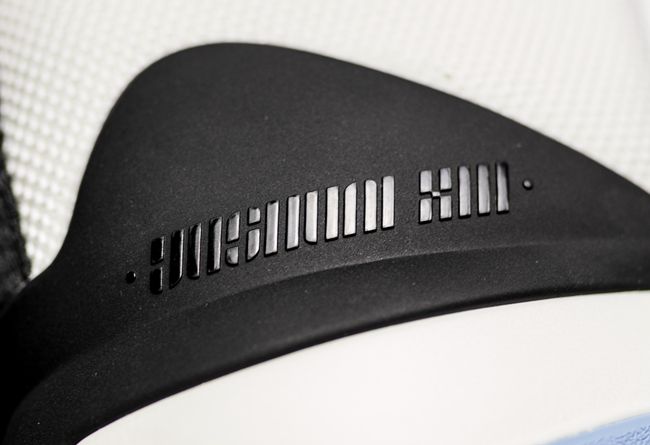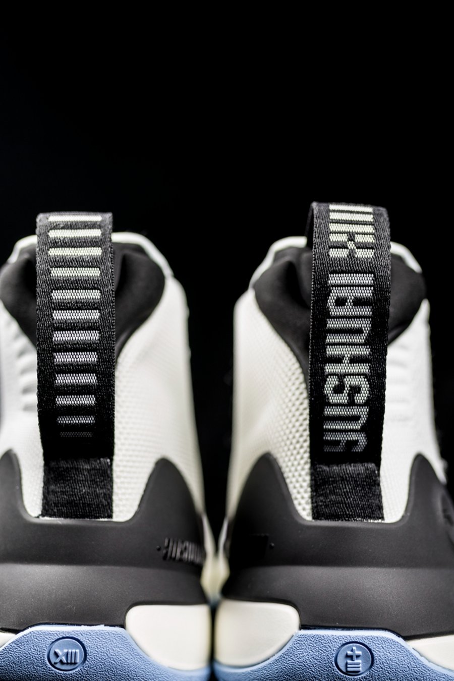 左脚后跟鞋提有 13 条白线,右脚印有驭帅的拼写字样,呼应鞋款的身份。