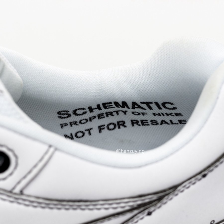 全白覆盖鞋身代表图纸底色,黑色车线与中底粗体线条,同分布在鞋面的设计文字相呼应。左、右后跟分别以复古 Nike Air 标志及传奇设计师 Tinker Hatfield 的签名呈现,最后再用乳白色果冻外底收尾,整体不仅个性十足,更颇具二次元气息。