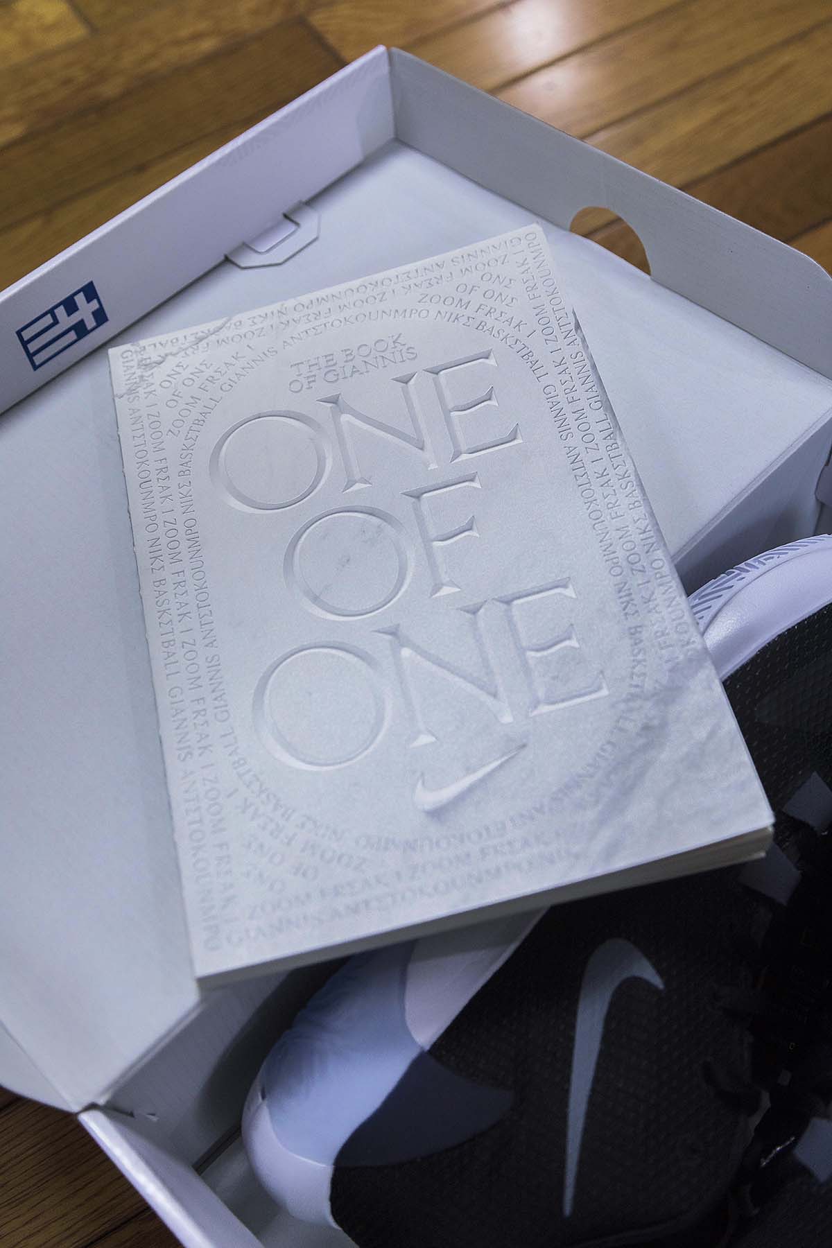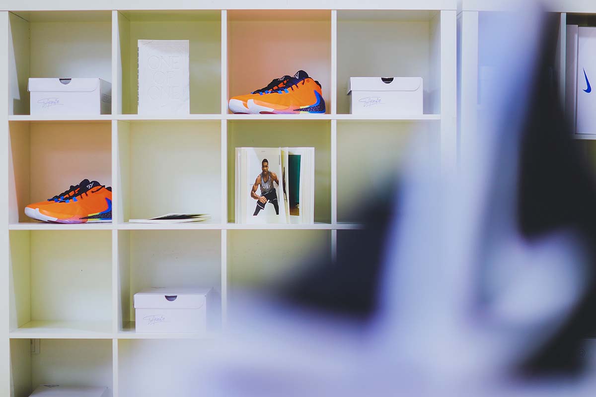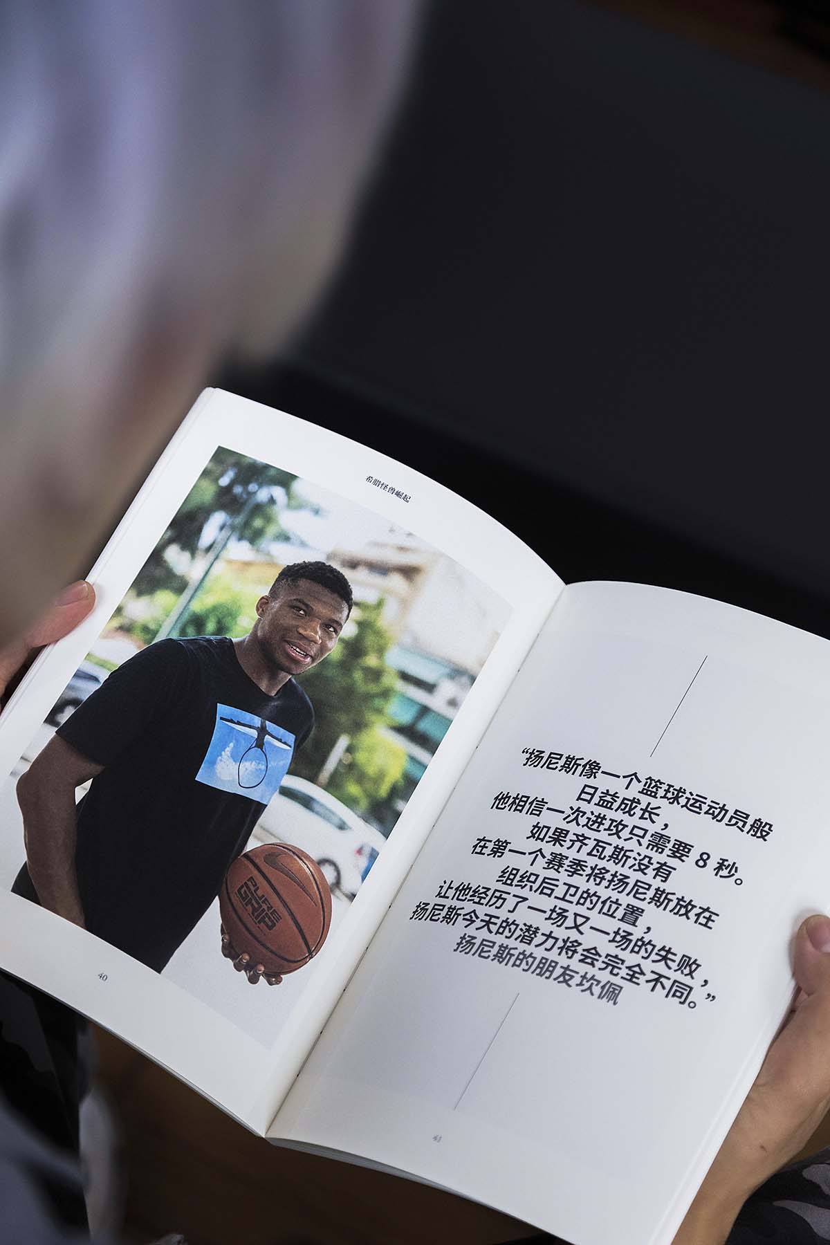 现场书柜中陈列着非市售的 《The Book of Giannis》书籍,讲述着字母哥成长经历与首款签名鞋的打造过程。